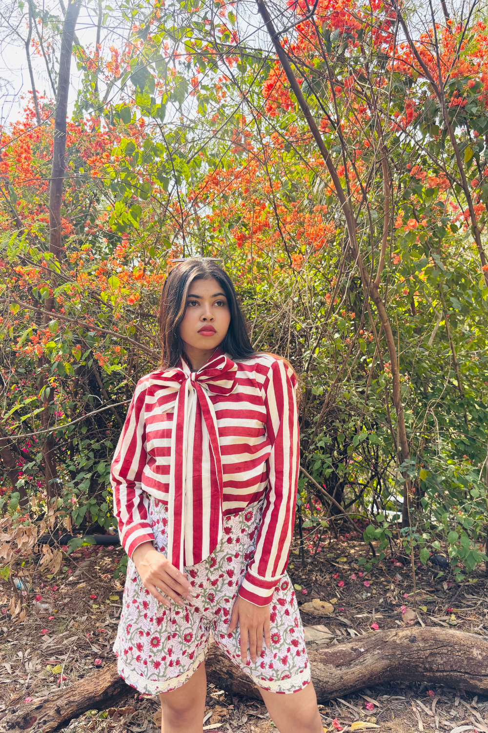 Dirty Martini co-ord Cotton hand block printed, panelled striped shirt with exaggerated bow detailed. High waisted floral print shorts with lace detailing.