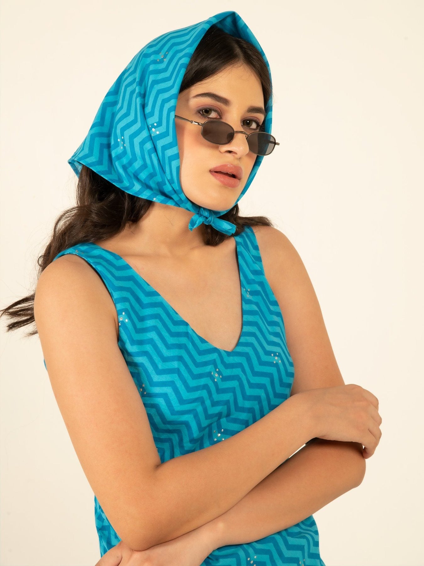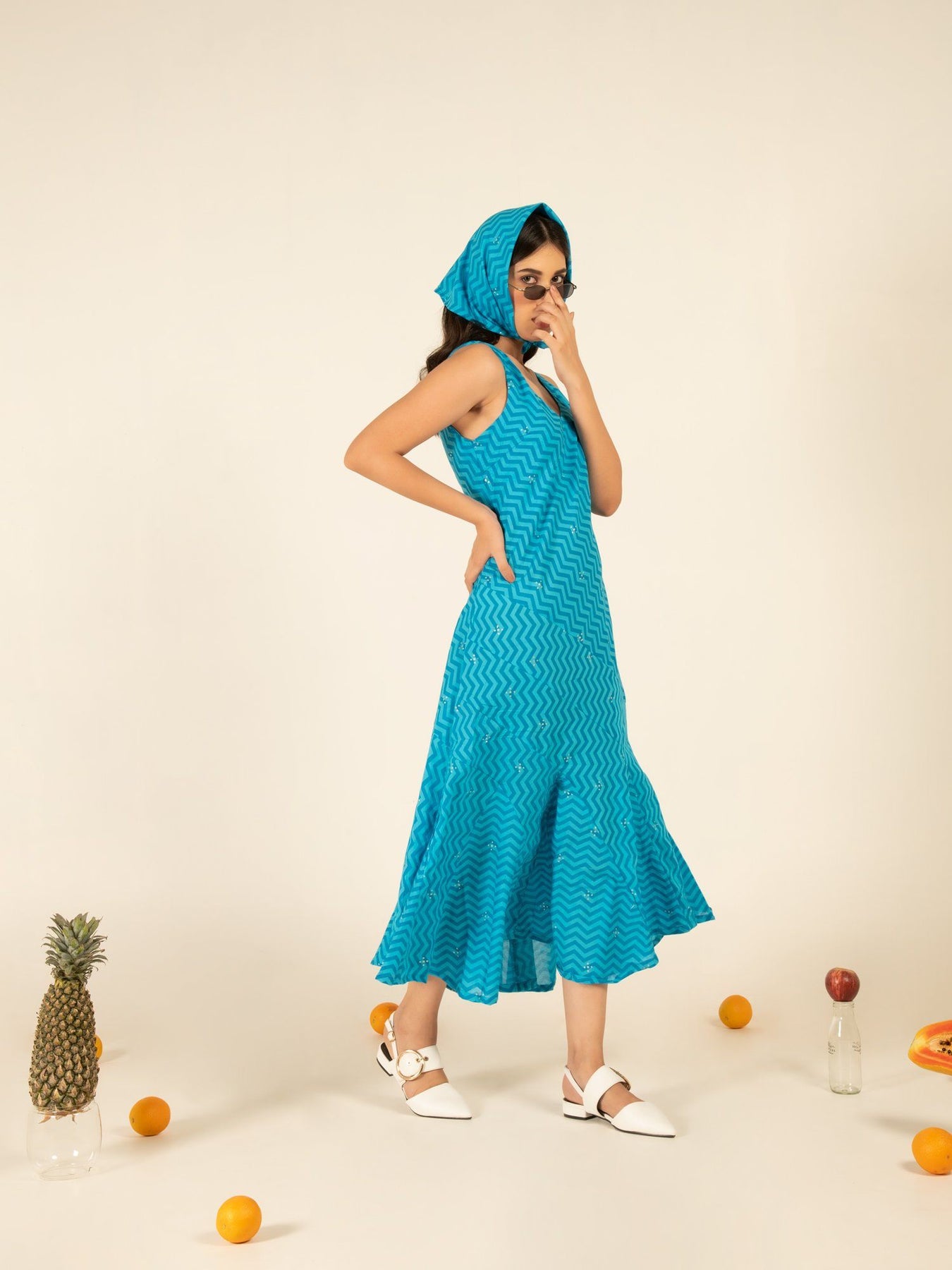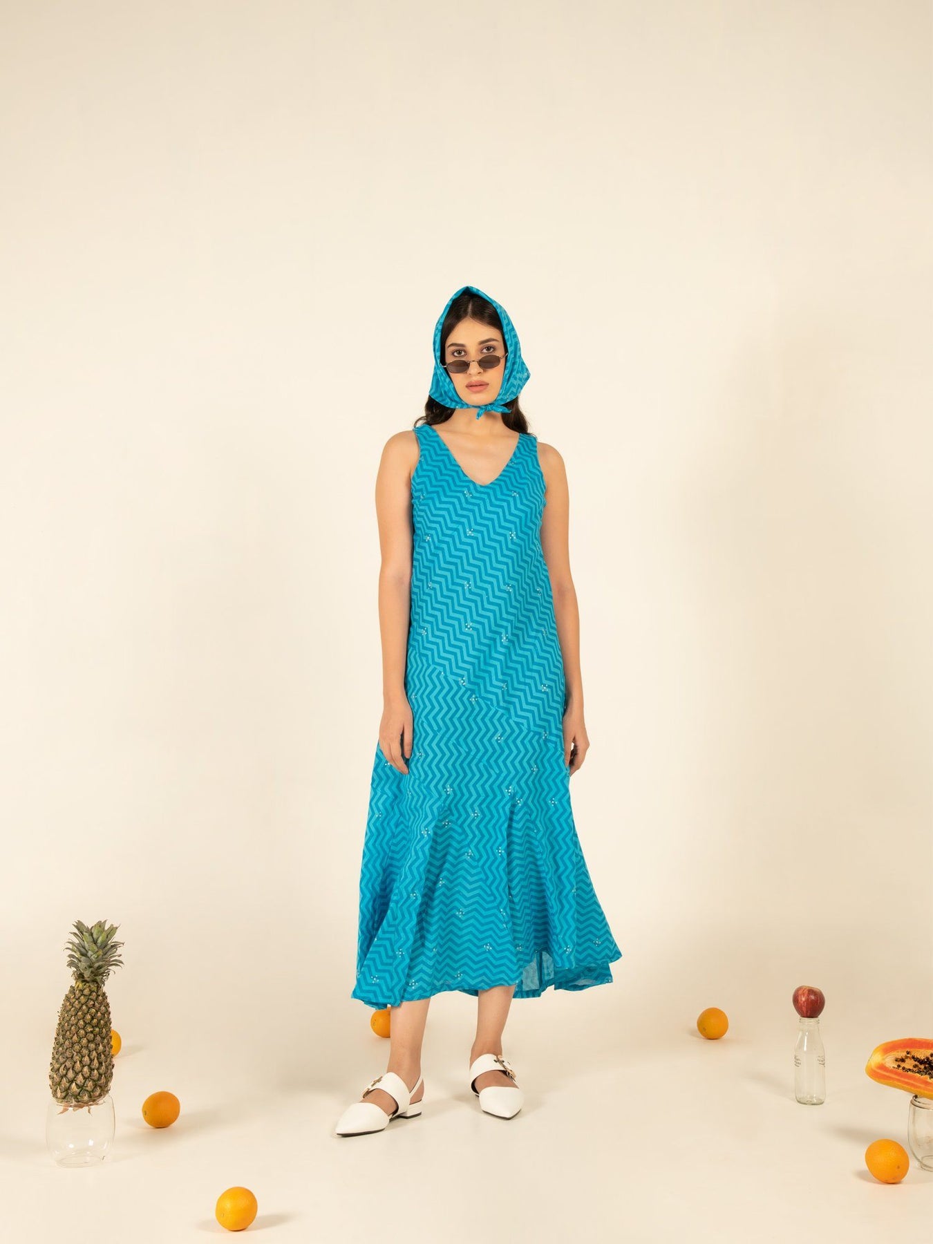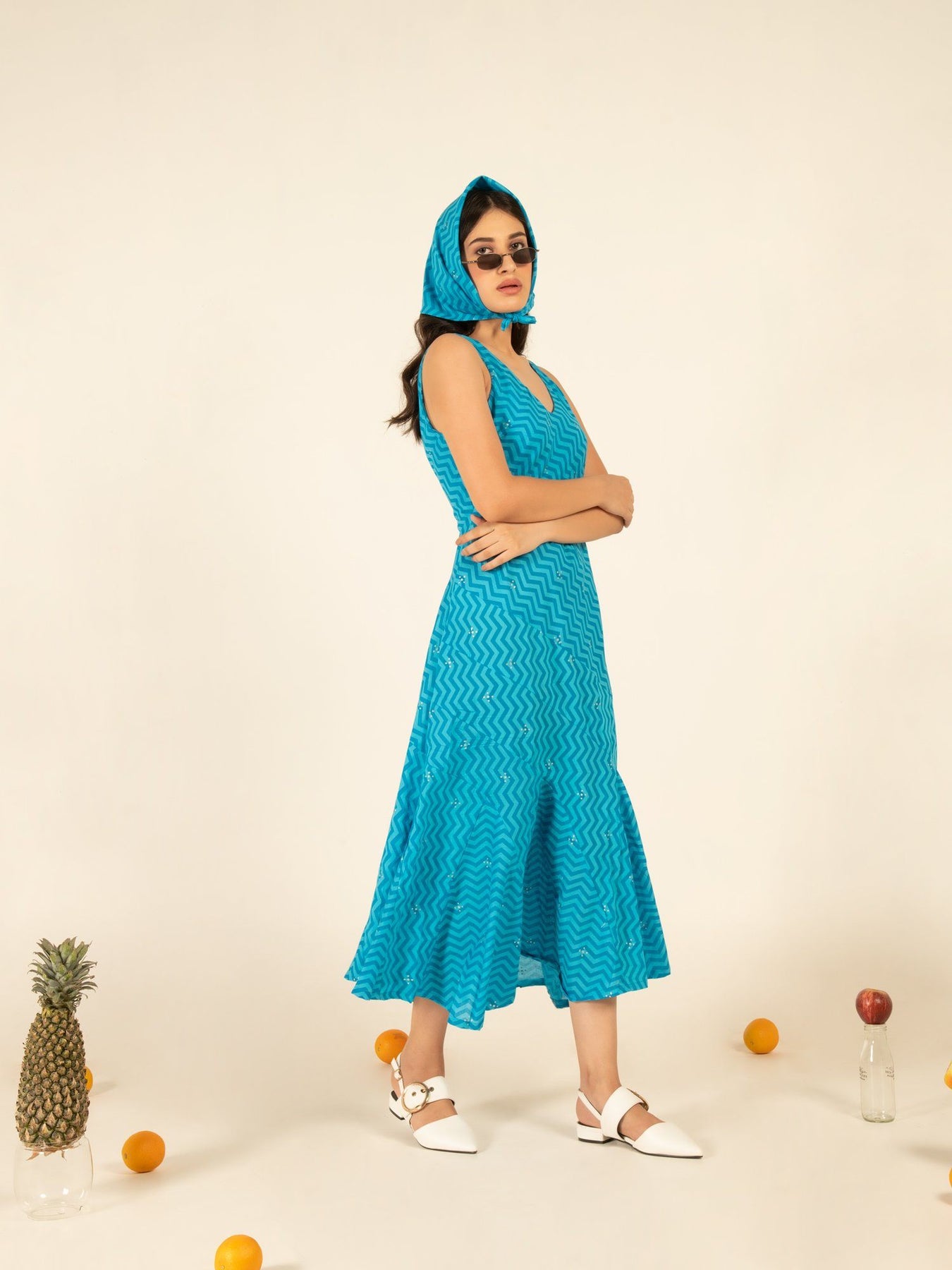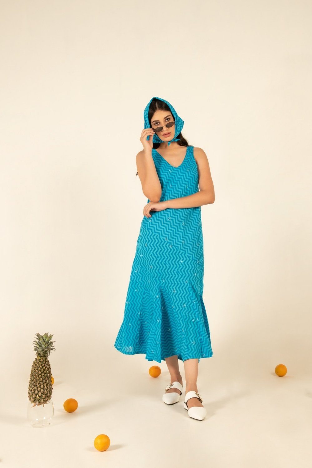 Cotton hand printed flounce dress in the most fun silhouette. This striped,V neck,sleeveless, midi dress is what our summer evening dreams are made of.