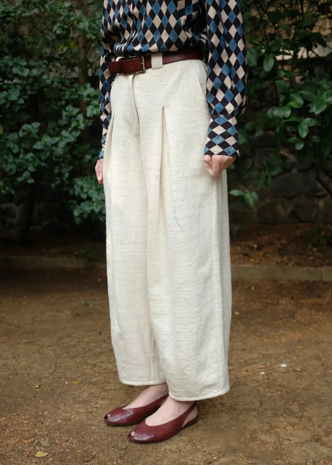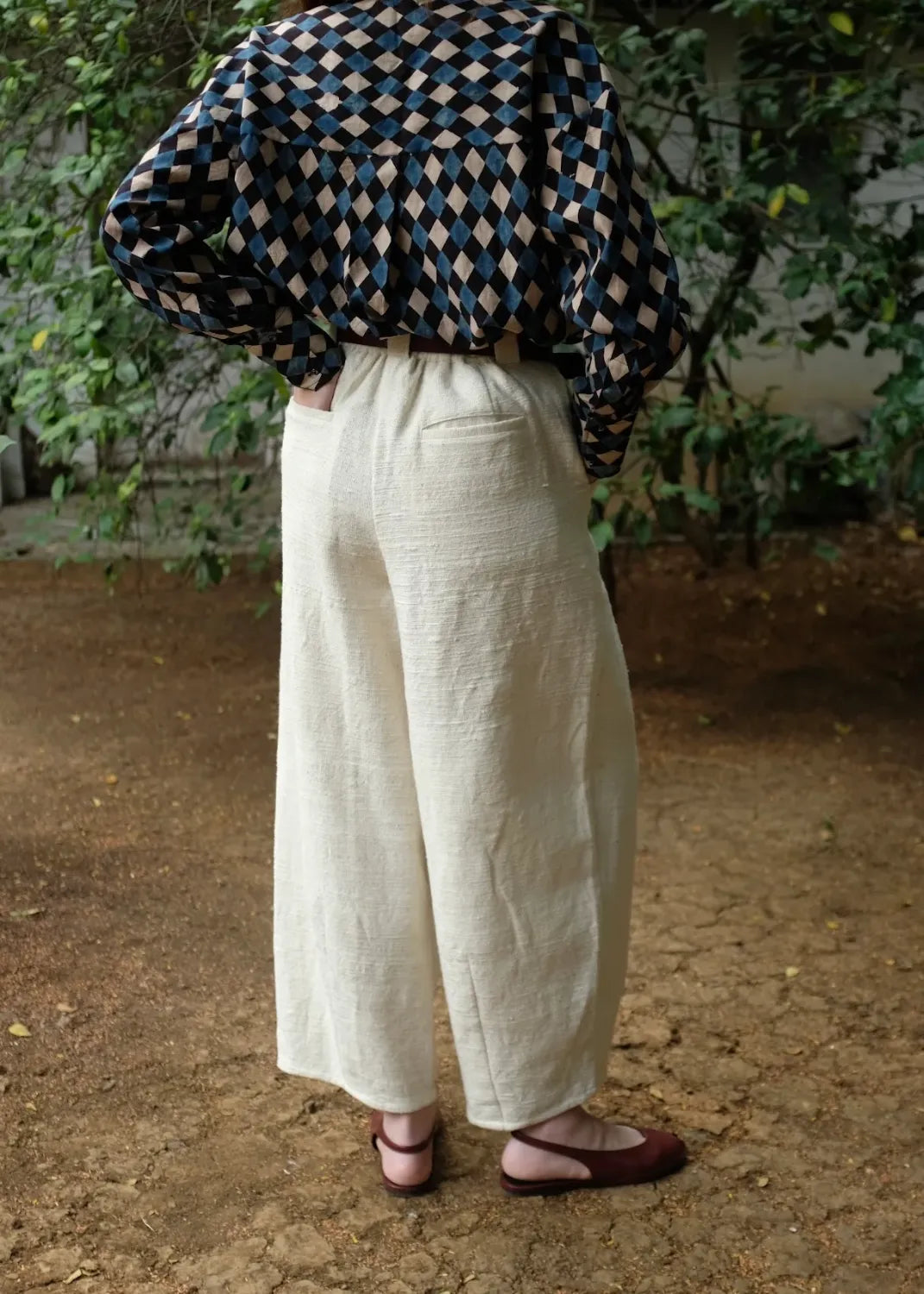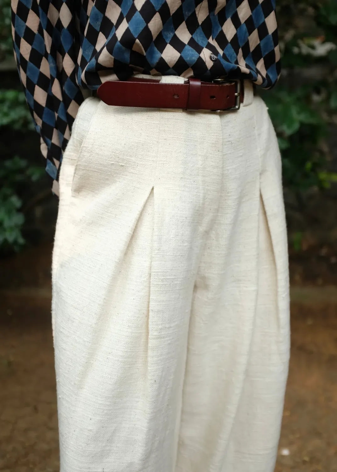 A timeless pant crafted using a heavyweight handspun handwoven indiginous cotton. Designed to form a barrel silhouette, two inverted box pleats fall from the waist and into large darts at the hem, creating a sculpted yet effortless look. A versatile staple with a fixed waistband at the front and elasticated back, wider than usual belt loops and pockets at the sides and back, large enough to sub a bag.