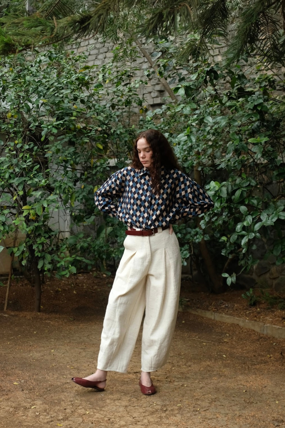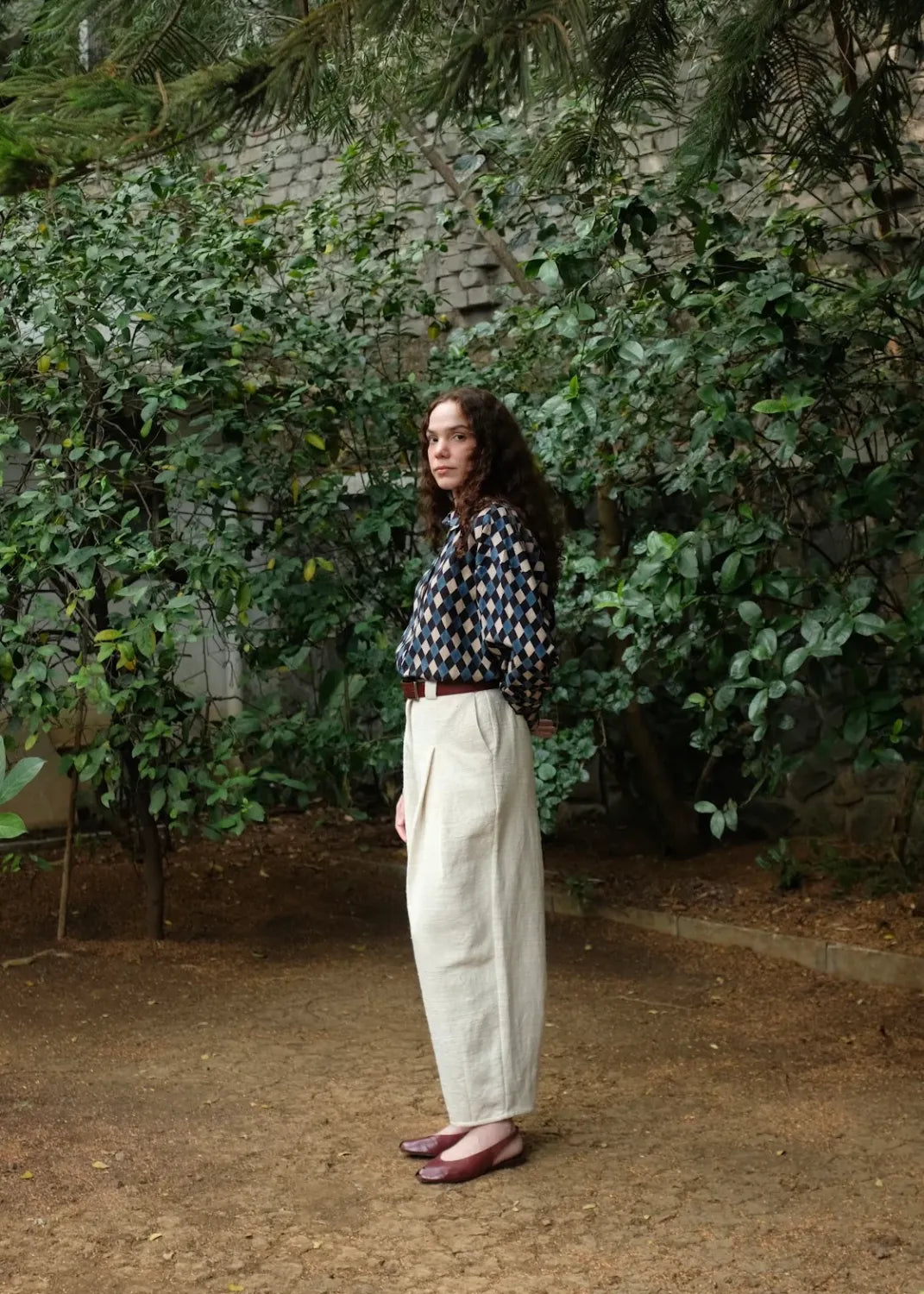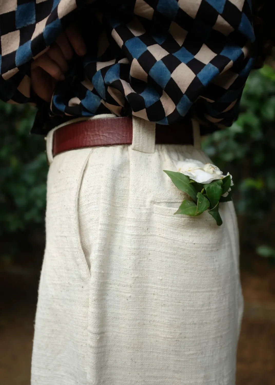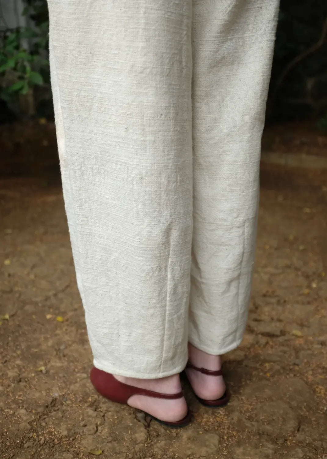 A timeless pant crafted using a heavyweight handspun handwoven indiginous cotton. Designed to form a barrel silhouette, two inverted box pleats fall from the waist and into large darts at the hem, creating a sculpted yet effortless look. A versatile staple with a fixed waistband at the front and elasticated back, wider than usual belt loops and pockets at the sides and back, large enough to sub a bag.
