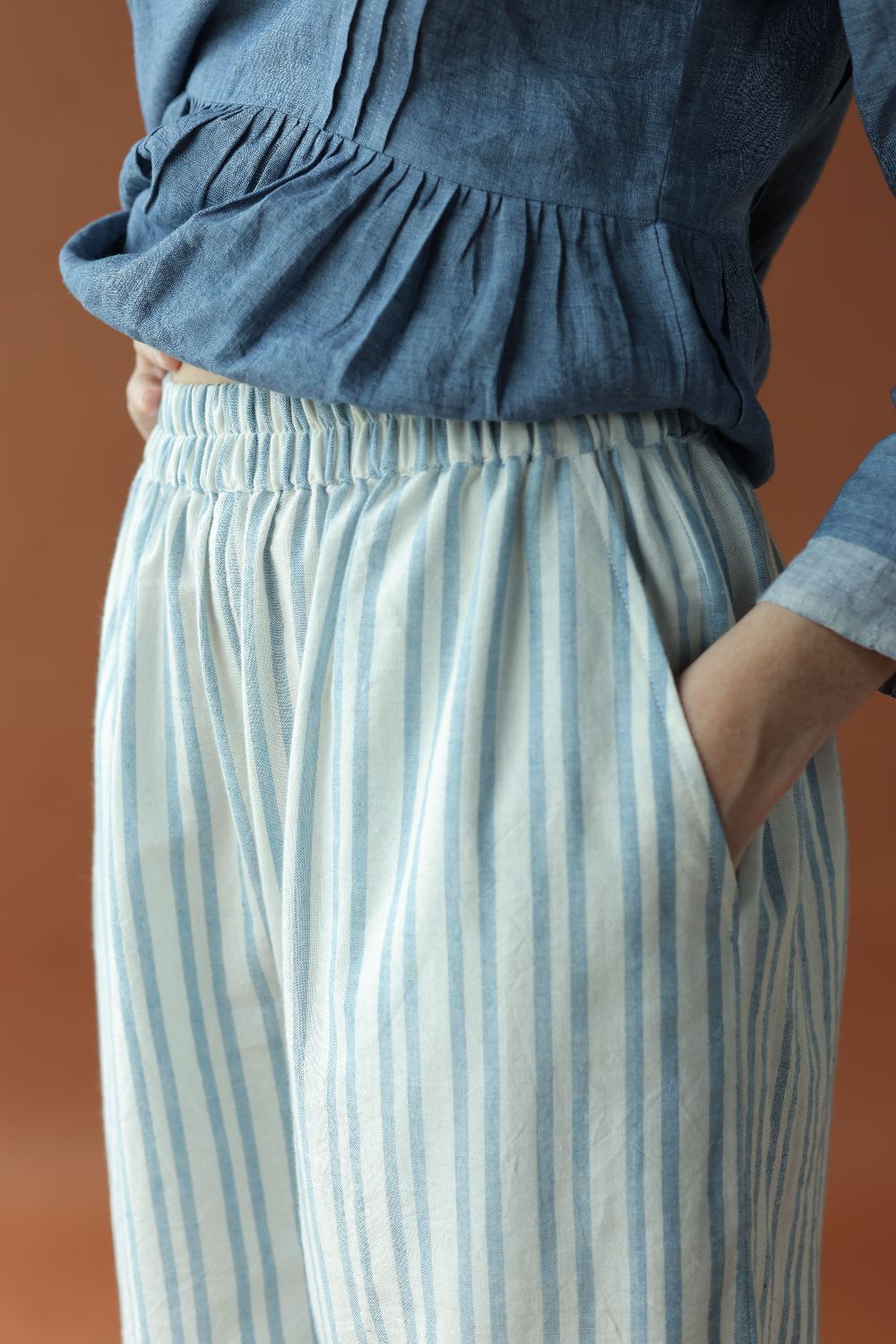 Cut in handwoven cotton, 'Alan' is a fun pair of carrot pants with thick stripes and a fully elasticated waistband.