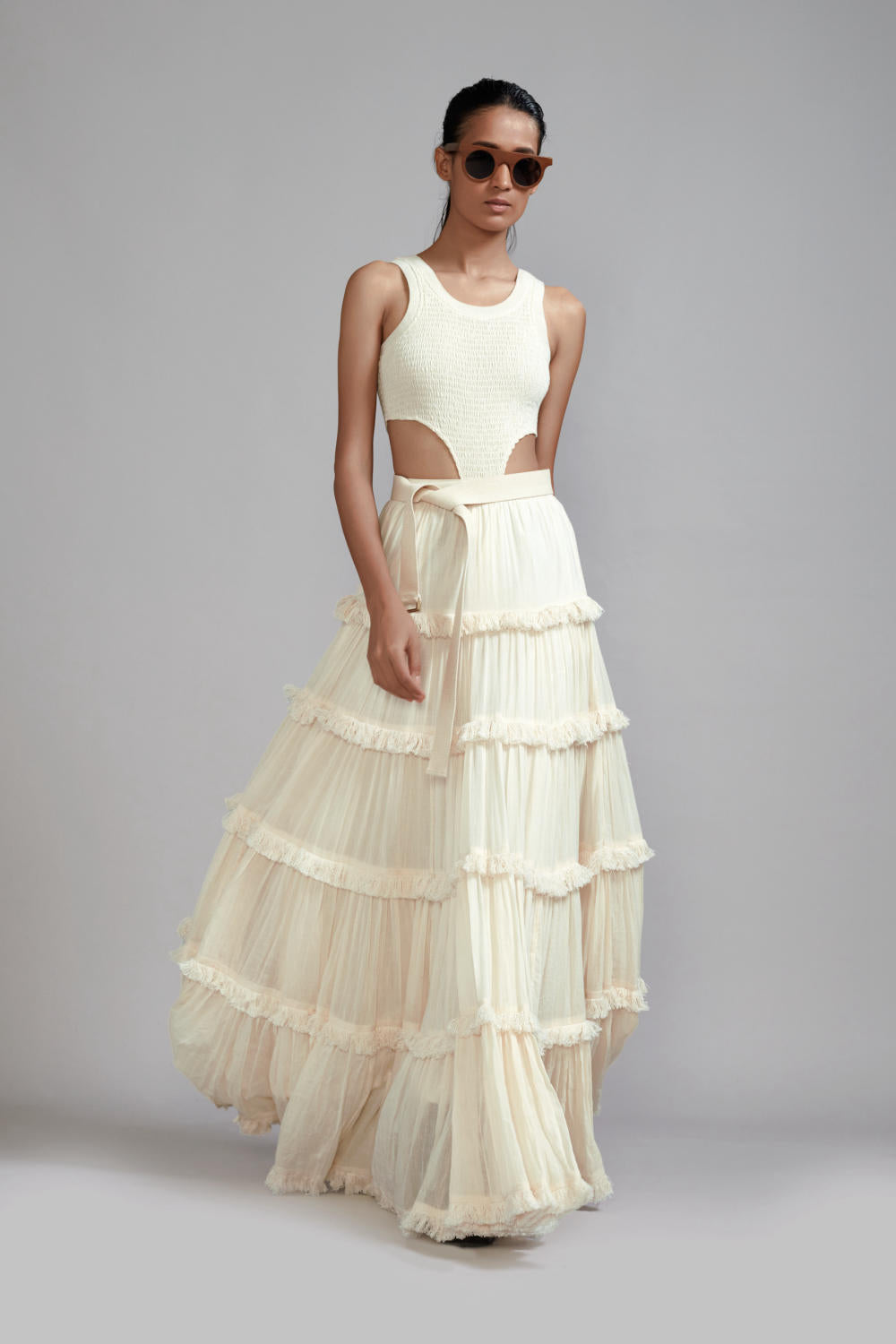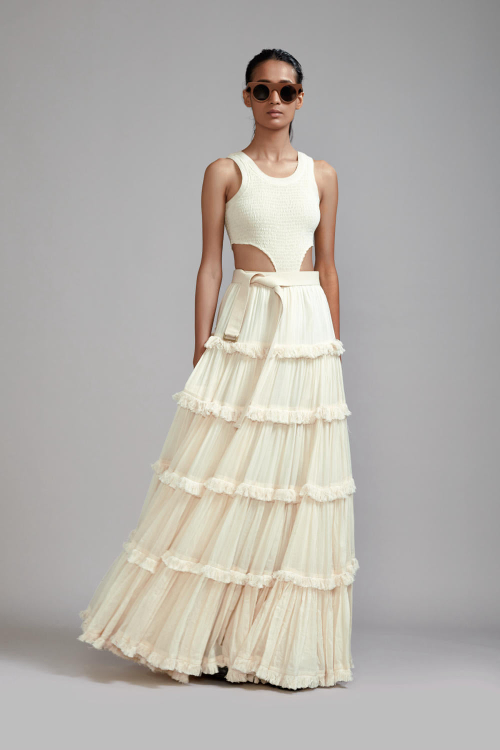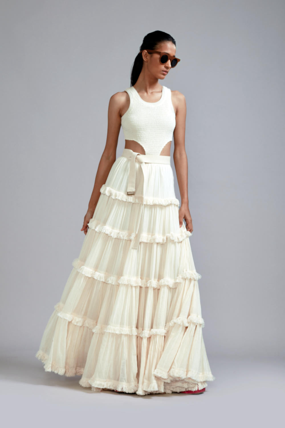 A pair of smocked bodysuiit and handspun mul fringed-tiered lehenga (set of 2)