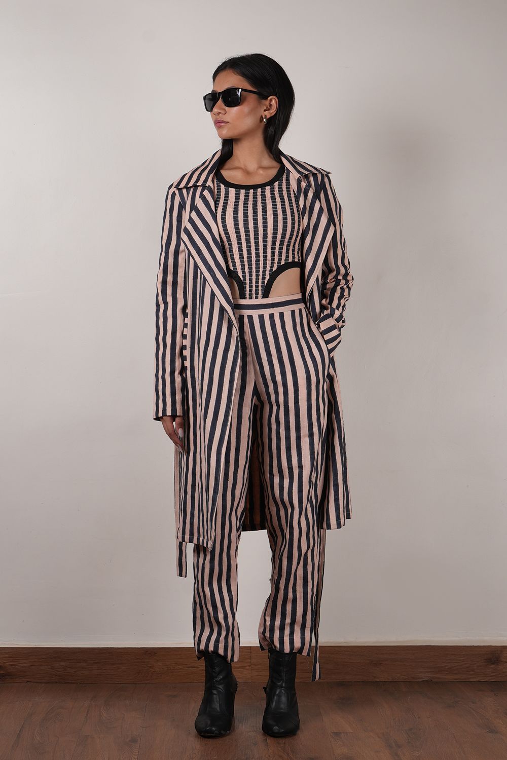 A handwoven cotton 3-piece set featuring a smocked bodysuit with delicate block prints and ribbed detailing at the neckline and armholes. Paired with narrow-bottom pants in block-printed stripes, complete with side pockets and an elasticated back for everyday comfort. Layered with a classic long trench jacket, showcasing block-printed stripes, side pockets, and a fabric belt — a timeless silhouette with a handcrafted twist.