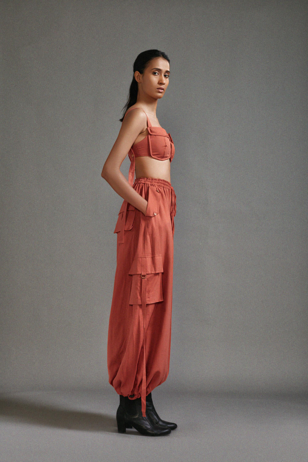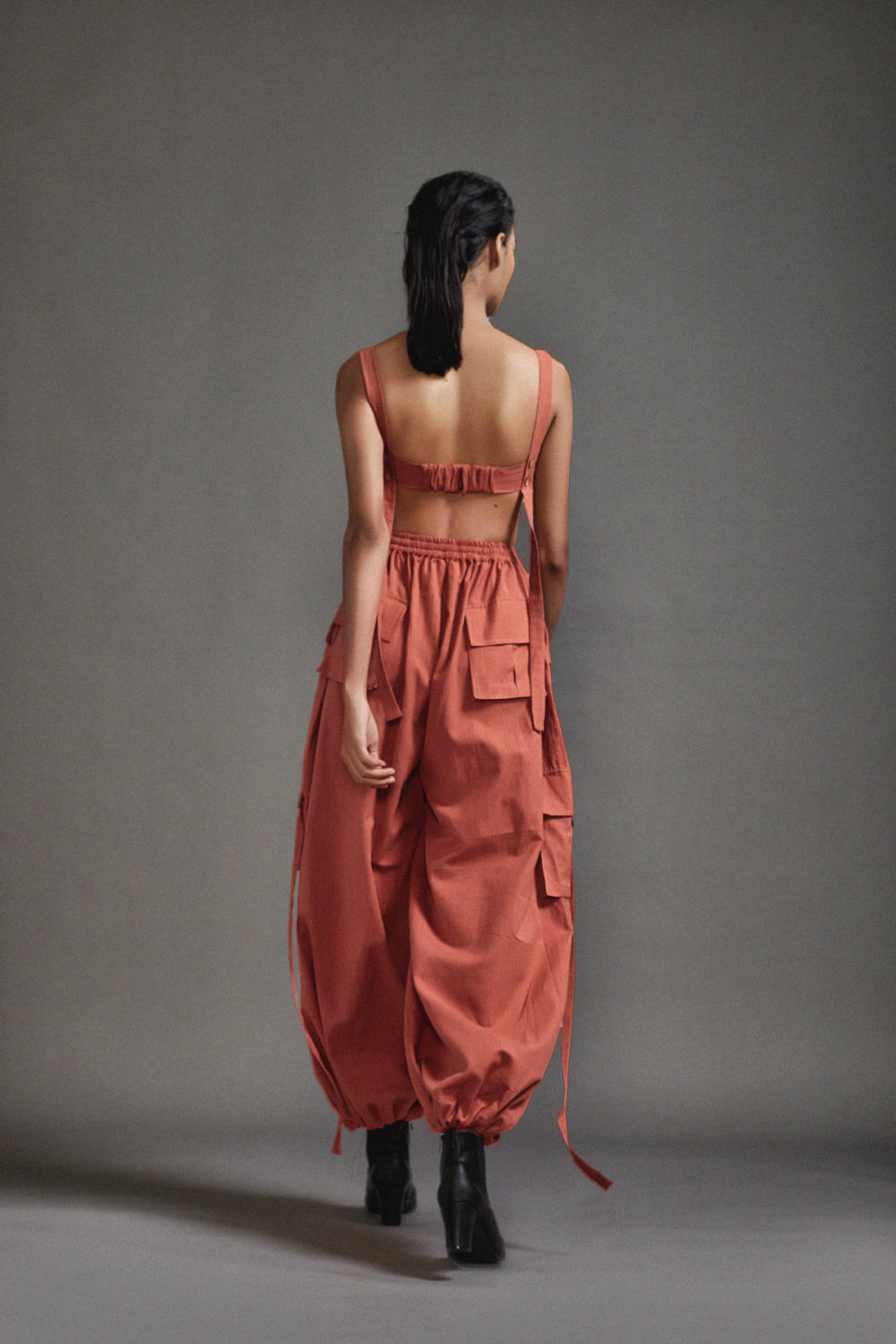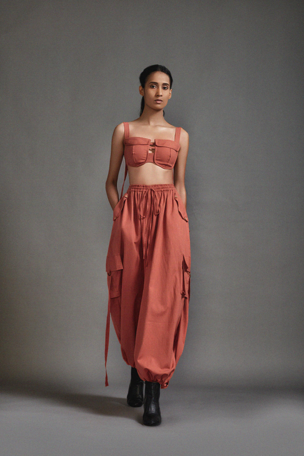A set of well-fitted pocket corset with adjustable straps and elastic back with Baggy-fit cargo pants with side pockets and elastic back.