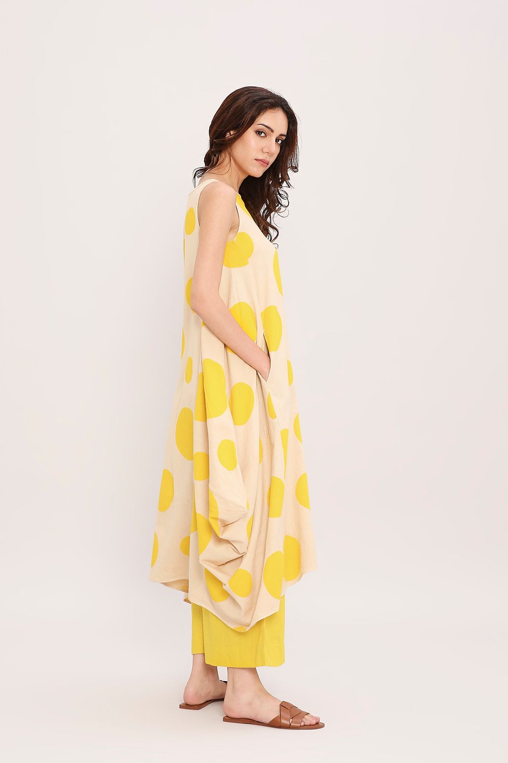 Our classic side cowl dress with a boat neckline makes a subtle yet striking statement, featuring handblocked polka dots all over. A perfect blend of effortless drape and playful detailing, styled here with matching pants for a coordinated and contemporary look.
