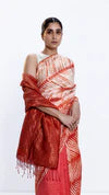 Handwoven silk shibori saree with a metallic pallav and solid pleats dyed in rust. It comes with an unstitched blouse piece.