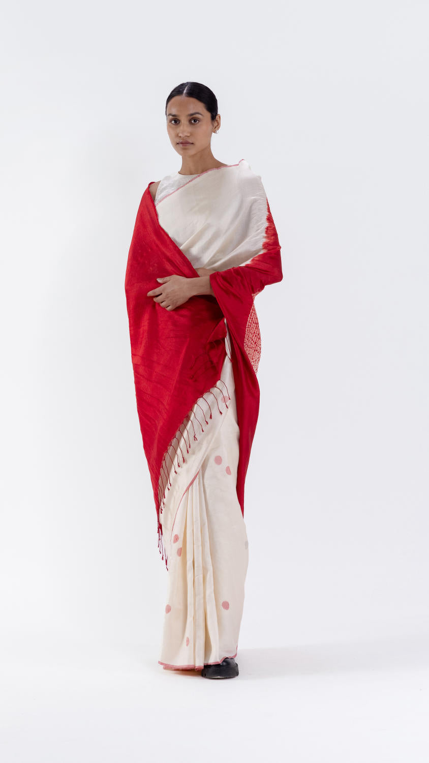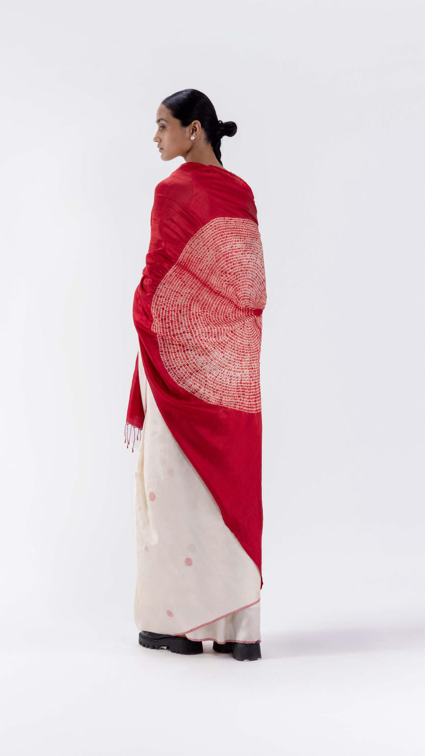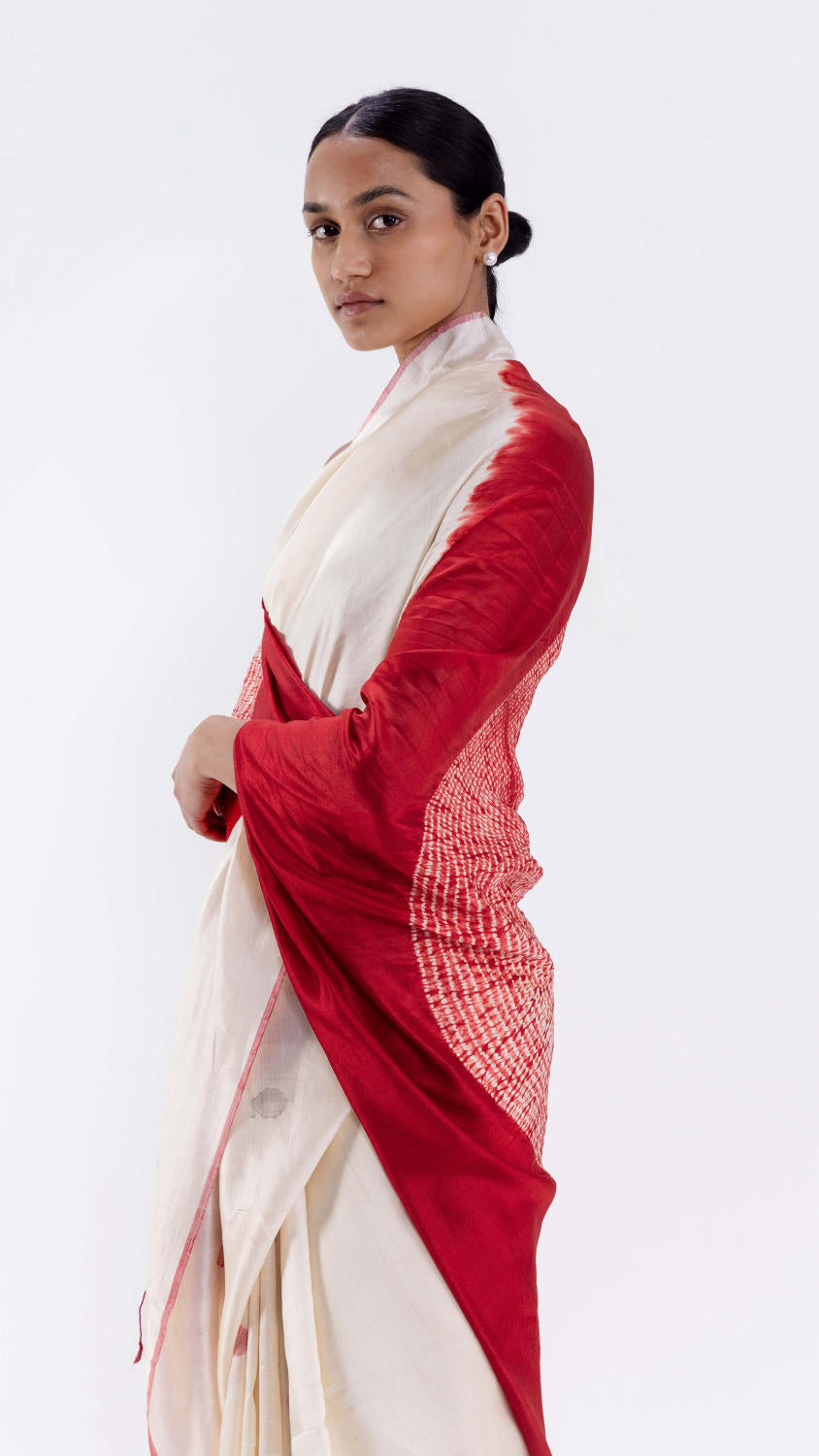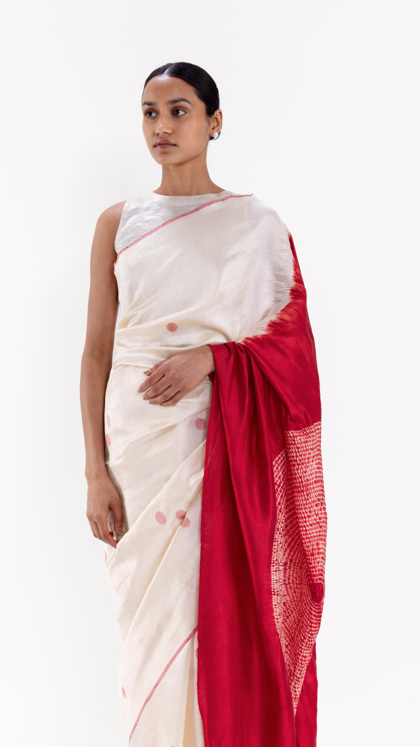 Handwoven jamdani silk saree with a contrast red selvedge and our signature shibori sleeve pallav. It comes with an unstitched striped metallic red blouse piece.