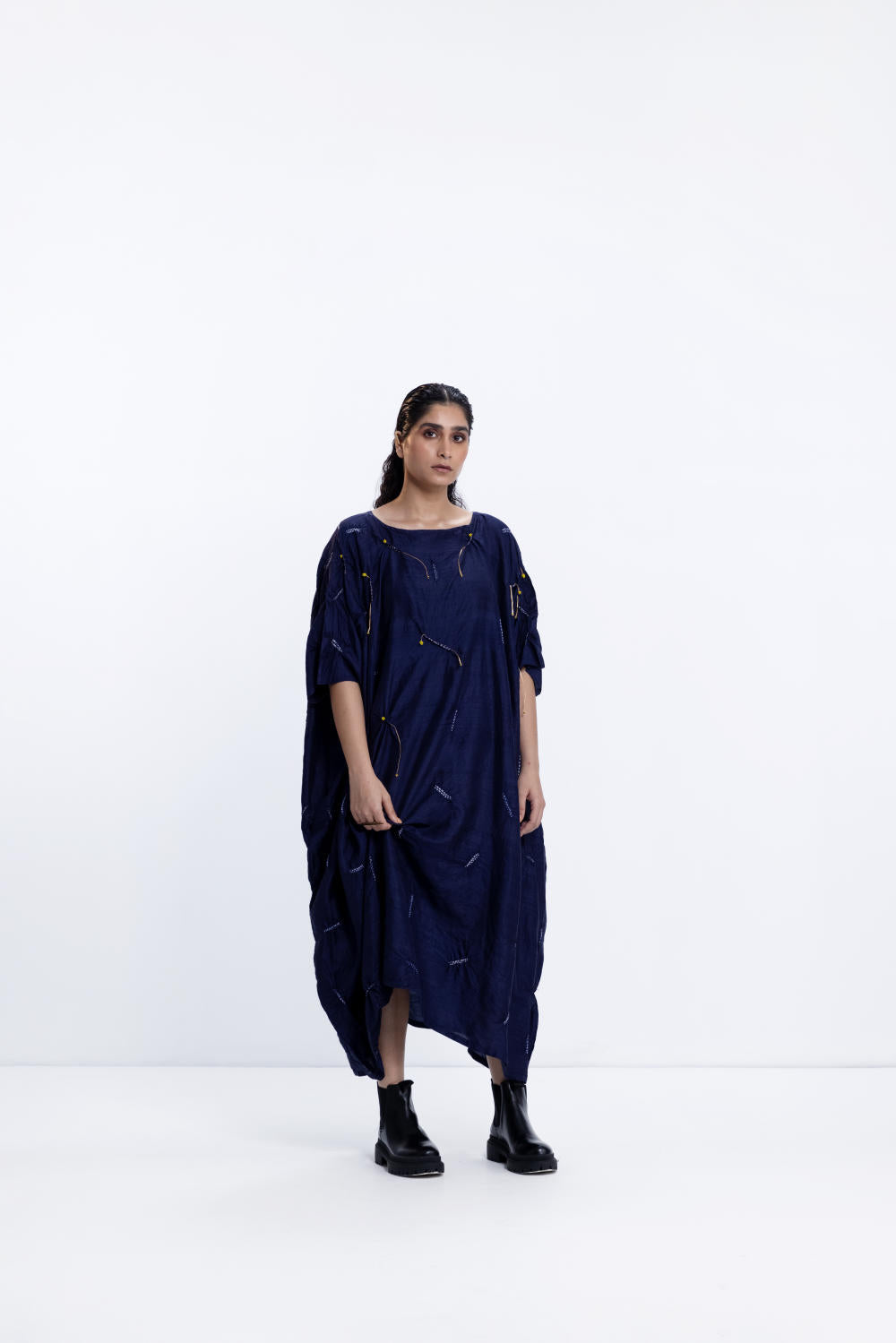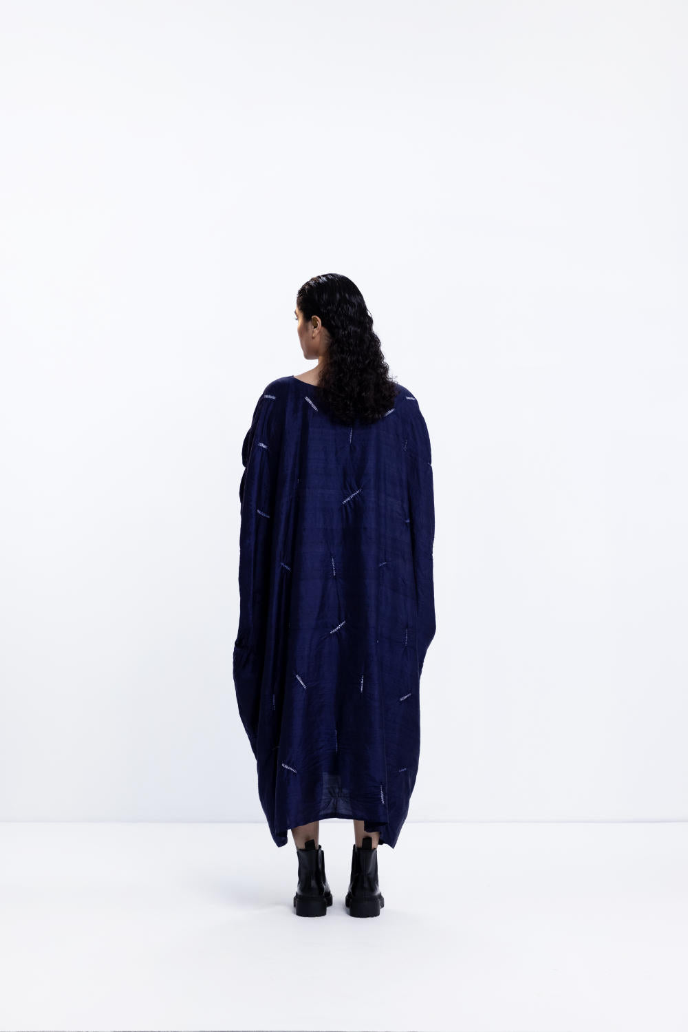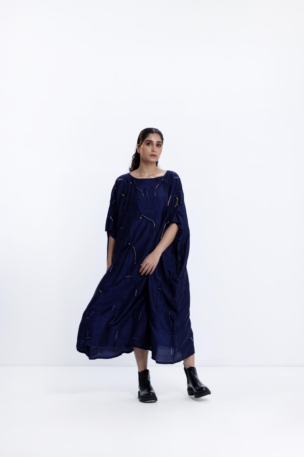 Freesize shibori kaftan with beaded detail in handwoven silk, dyed in navy.