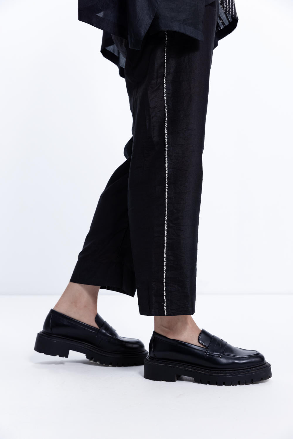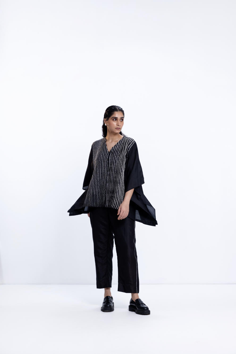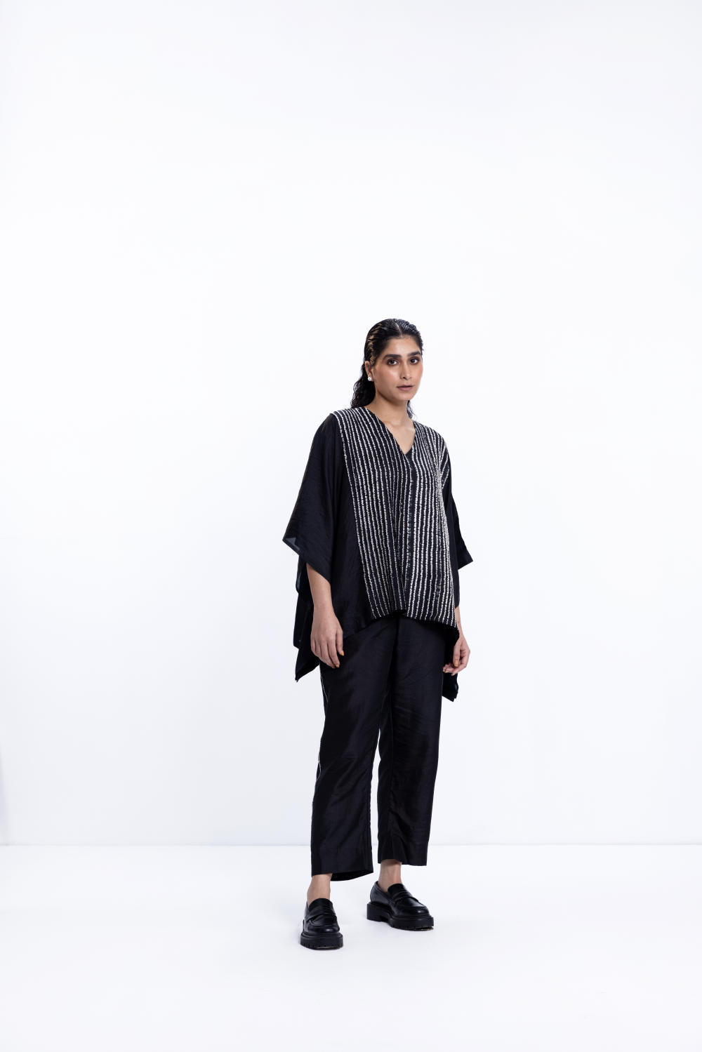 Freesize shibori tunic in silk, dyed in black. The tunic is paired with black pants with a nui shibori detail on the side seam.