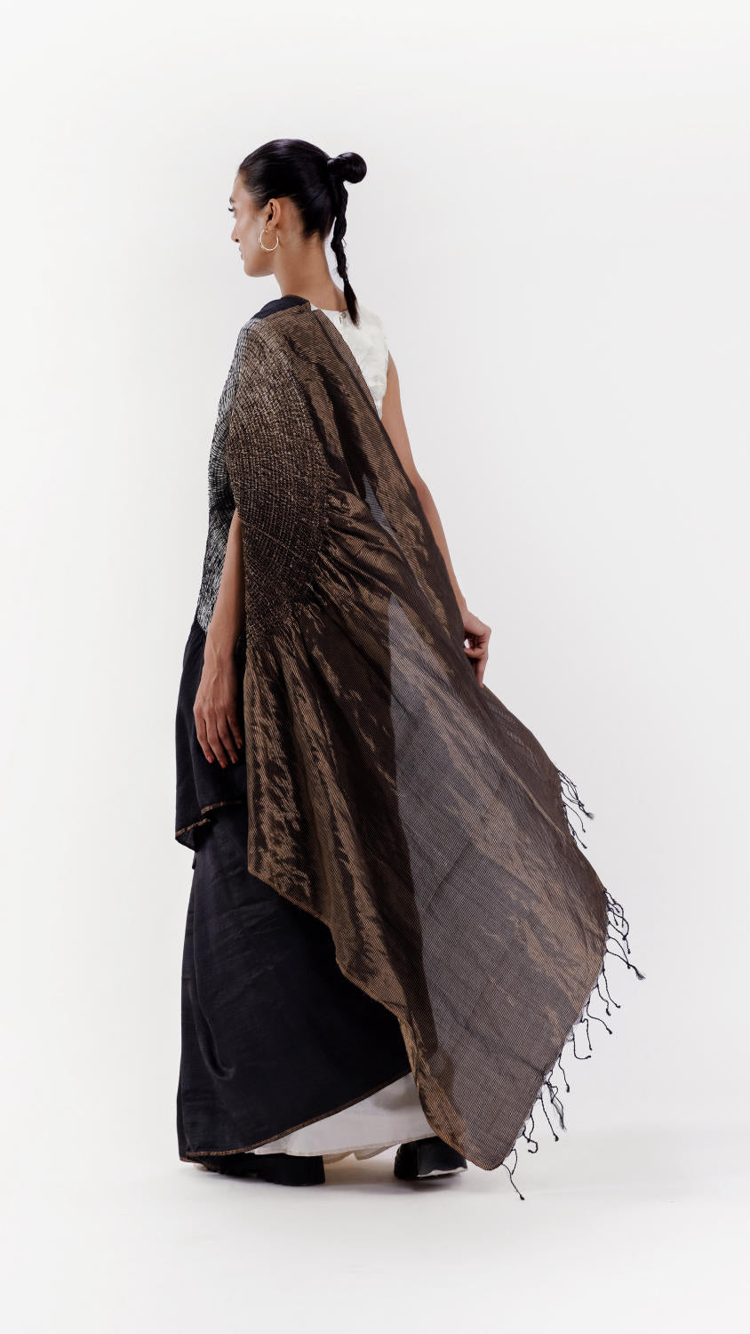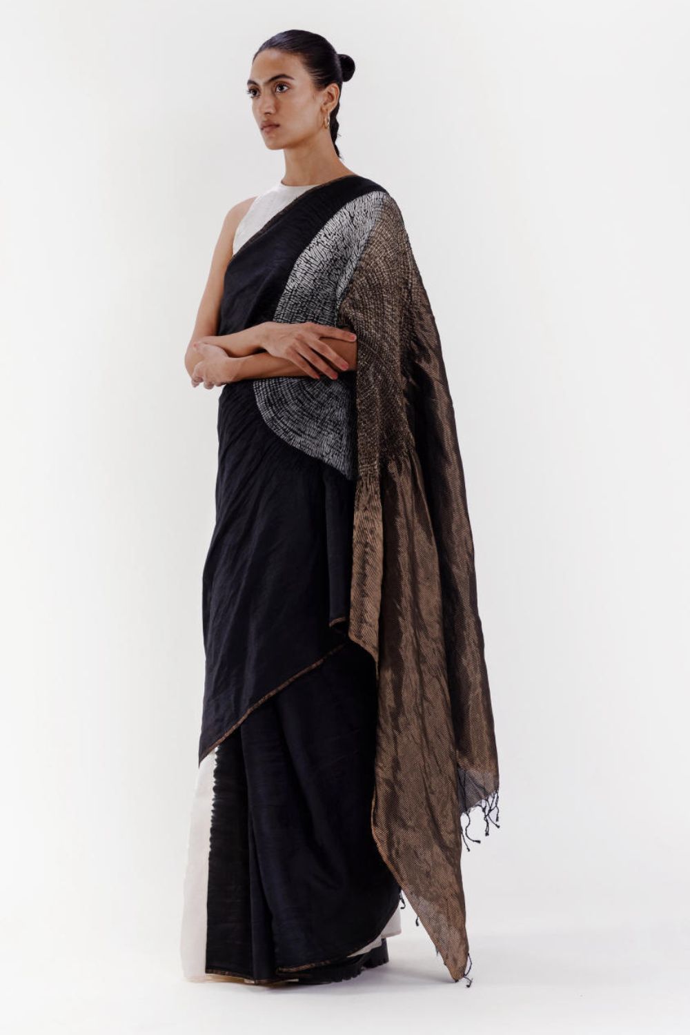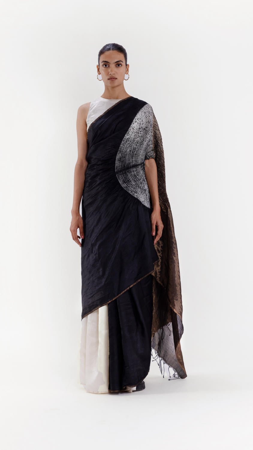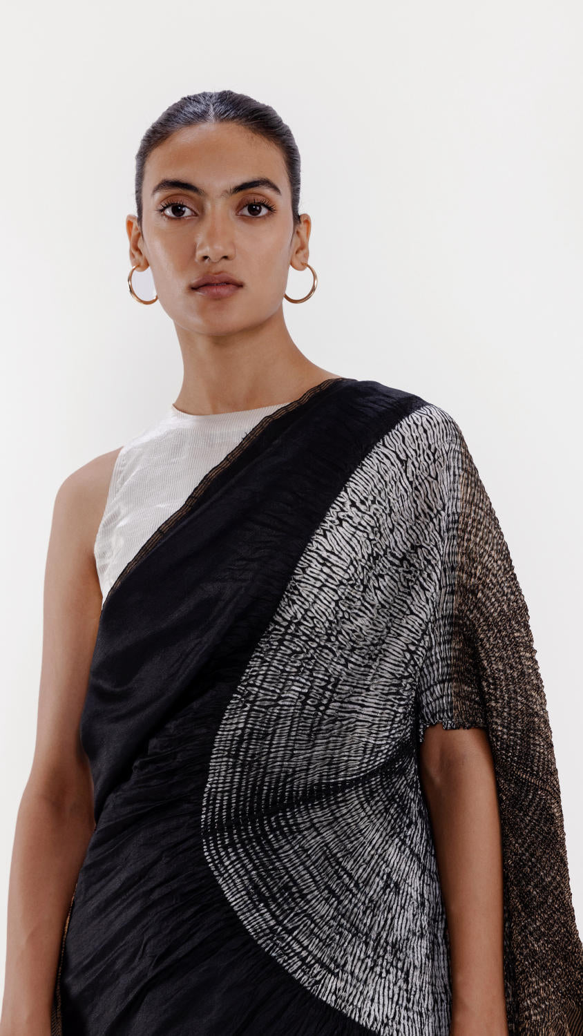 Handwoven silk saree with our signature shibori sleeve detail and a metallic pallav, dyed in black. The pleats are in a contrast ivory. It comes with an unstitched ivory silk blouse piece.