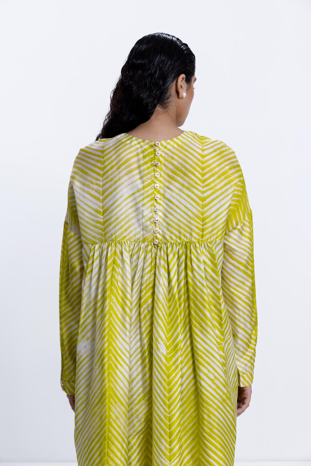 Freesize shibori dress in silk, dyed in lime.