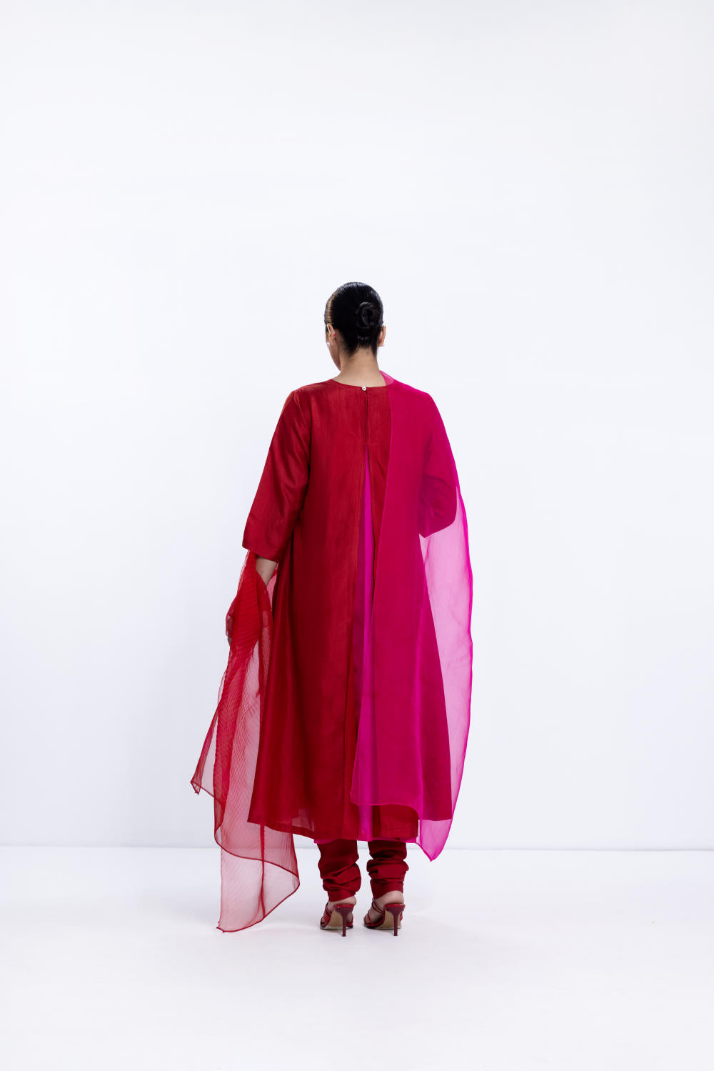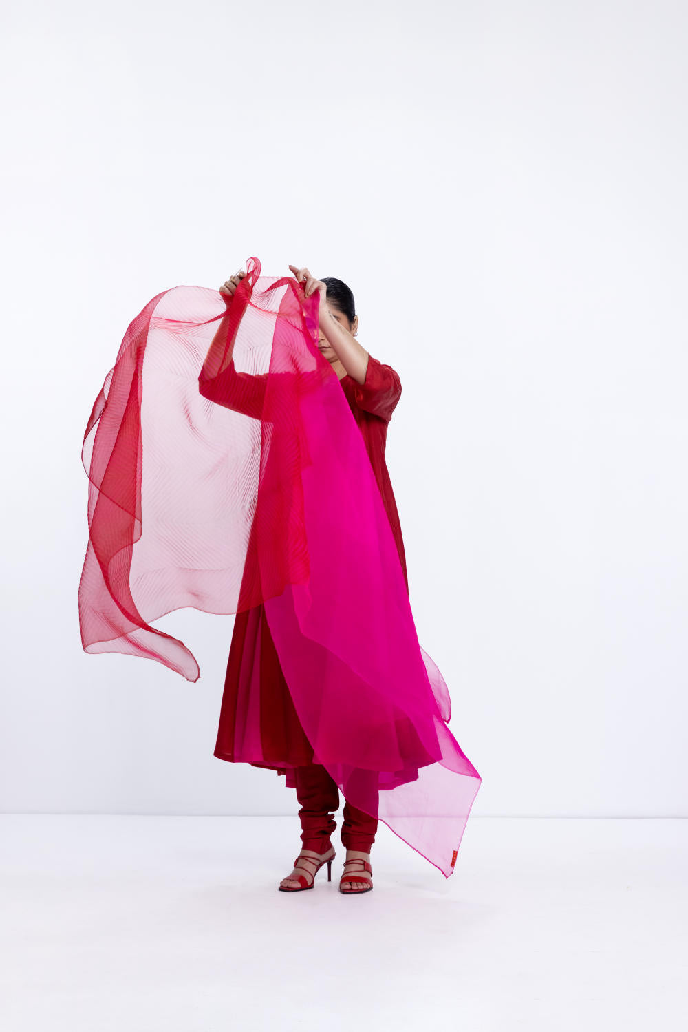 Organza shibori dupatta dyed in rani and red.
