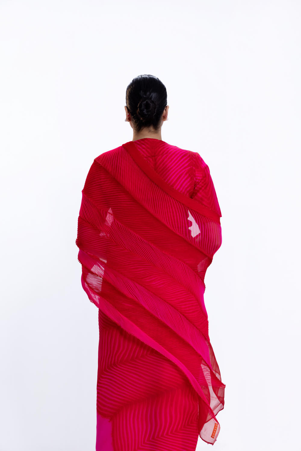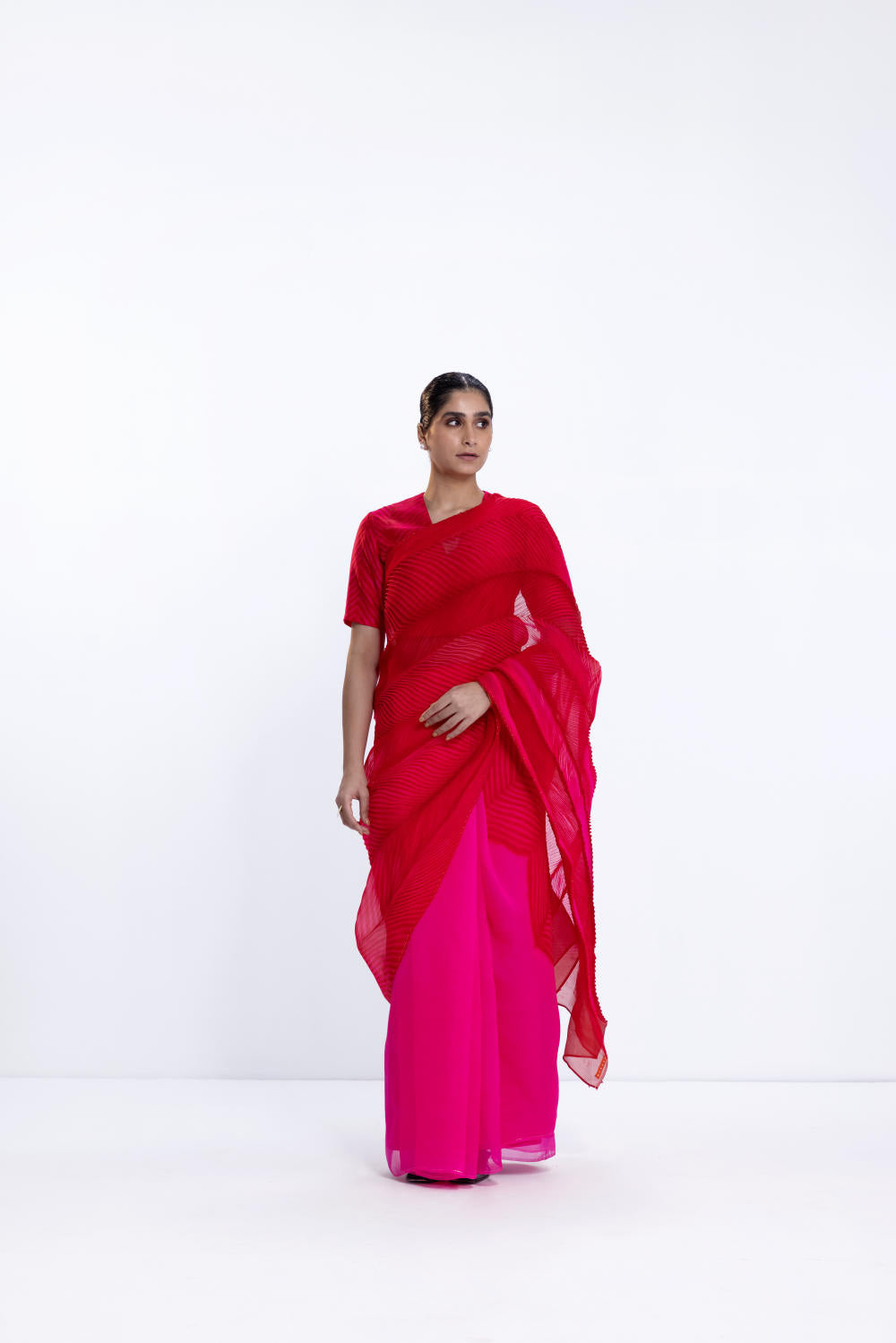 Organza shibori saree dyed in rani and red, with solid emerald pleats. It comes with an unstitched blouse piece.