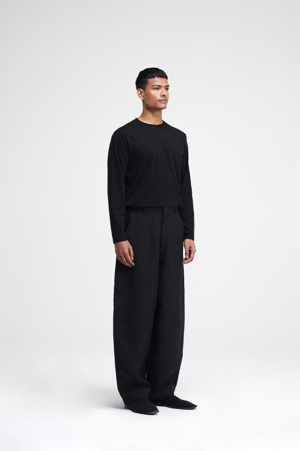 Our Koji pants are a relaxed-fit barrel-leg pants that offer a laid-back silhouette. Featuring back darts for shape and front cross-pockets for practicality, the hand-embellished hem and pockets offer a unique, artisanal touch. The embroidery is made up of French Knots and beads, combining comfort and intricate craftsmanship.