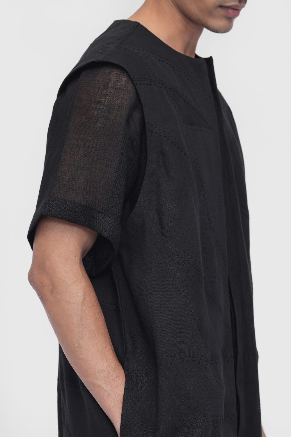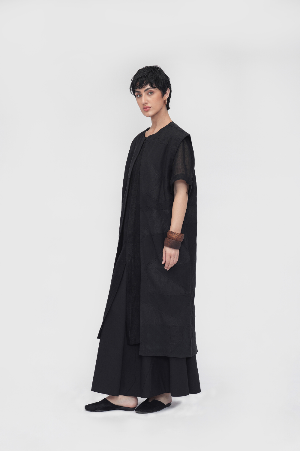 A relaxed, oversized overlay with a barrel-shaped silhouette. Crafted in patchwork fabric with intricate kantha embroidery, each stitch maps a journey across texture and form. Designed with a round neckline, front opening, and side seam pockets. Fully lined, with a back slit for ease of movement. Overlay Comes in Size: ONE (2XS,XS,S), TWO (M,L,XL), THREE (2XL,3XL,4XL)