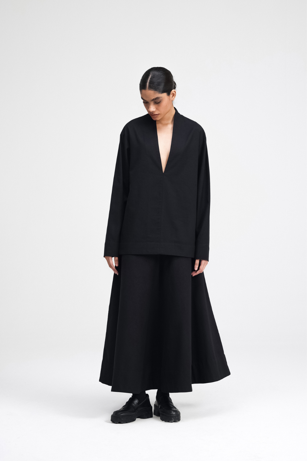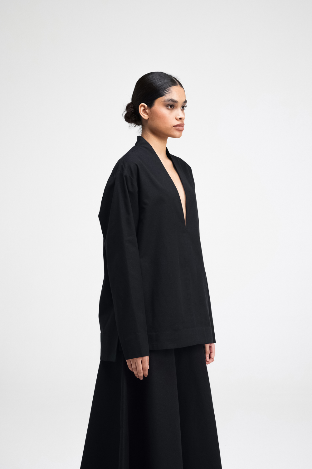The Yu relaxed-fit top combines effortless style with a modern edge. The plunge neckline and full sleeves with a button placket offer a sophisticated look, while the back yoke adds structure. The high-low hem adds a contemporary twist, making it perfect for both casual and elevated looks.