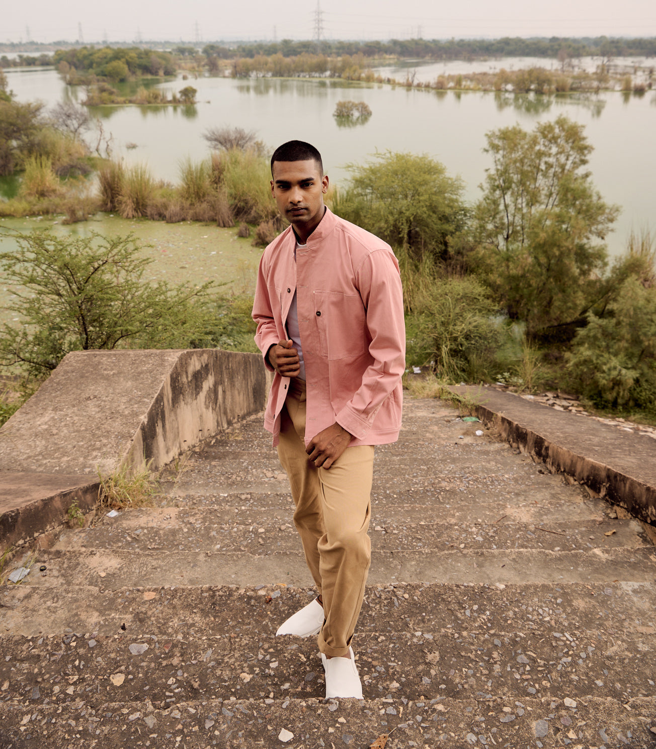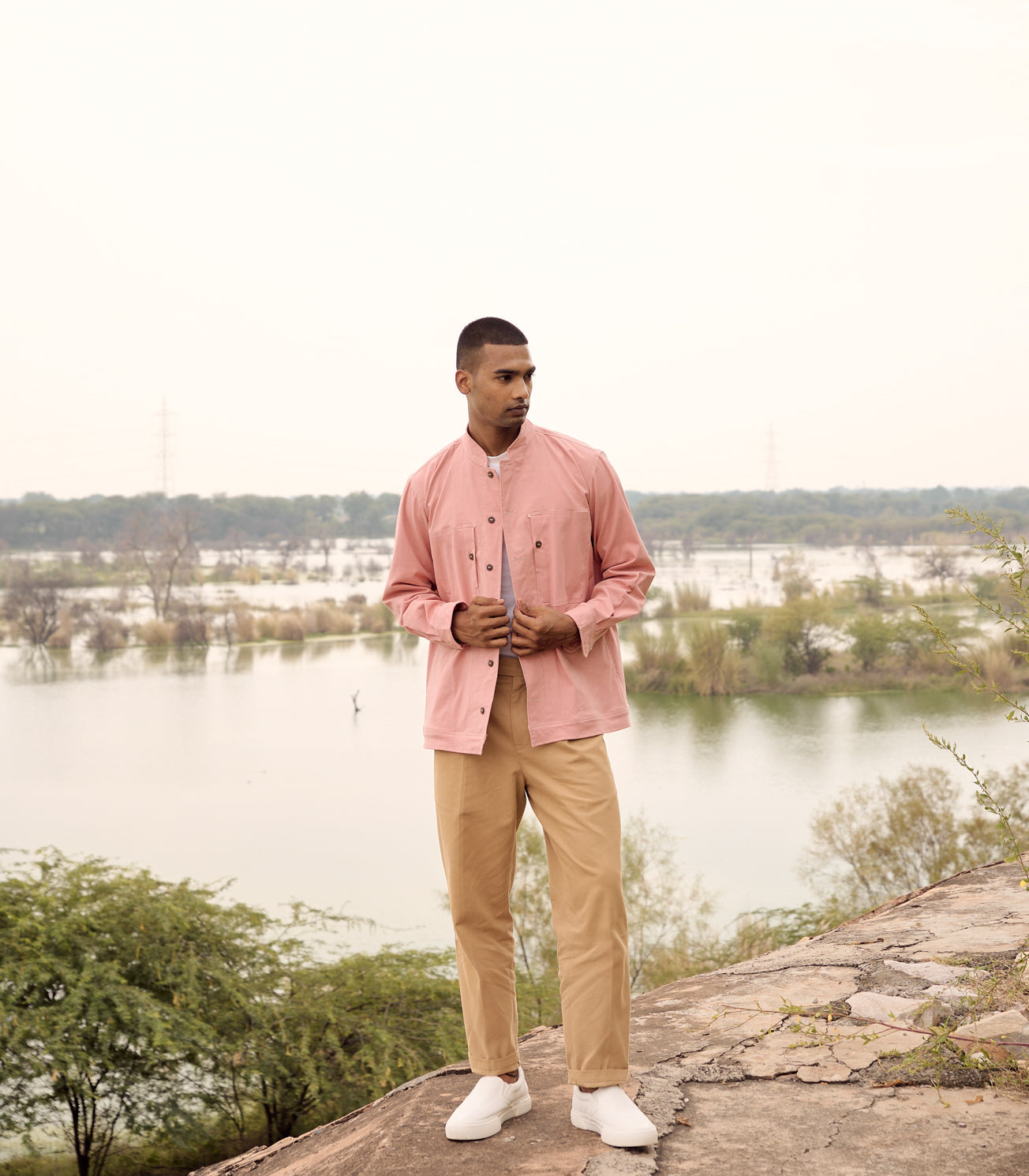 A peach pink twill jacket with mandarin collar, button cuff opening, full sleeves and two front patch pockets with button detailing.