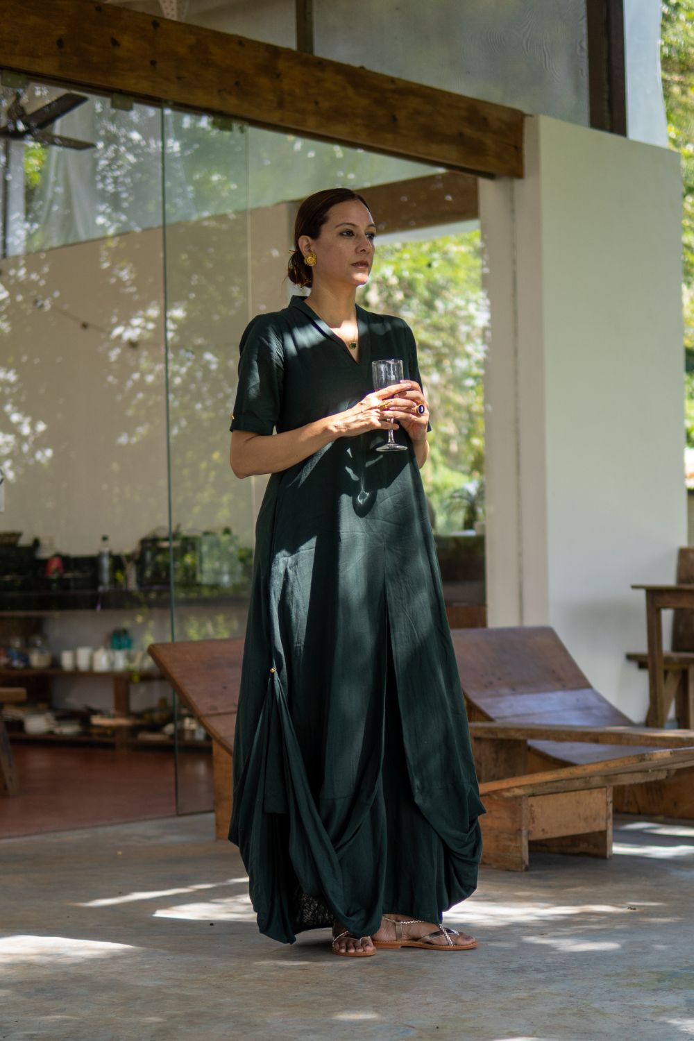 "The wilderness is wild in serendipity", said the sherpa. A forest green, cotton jhabla, with half sleeves and golden yellow, pin-tuck detailing on the sides for days when you are ready to welcome a universe full of surprises.
