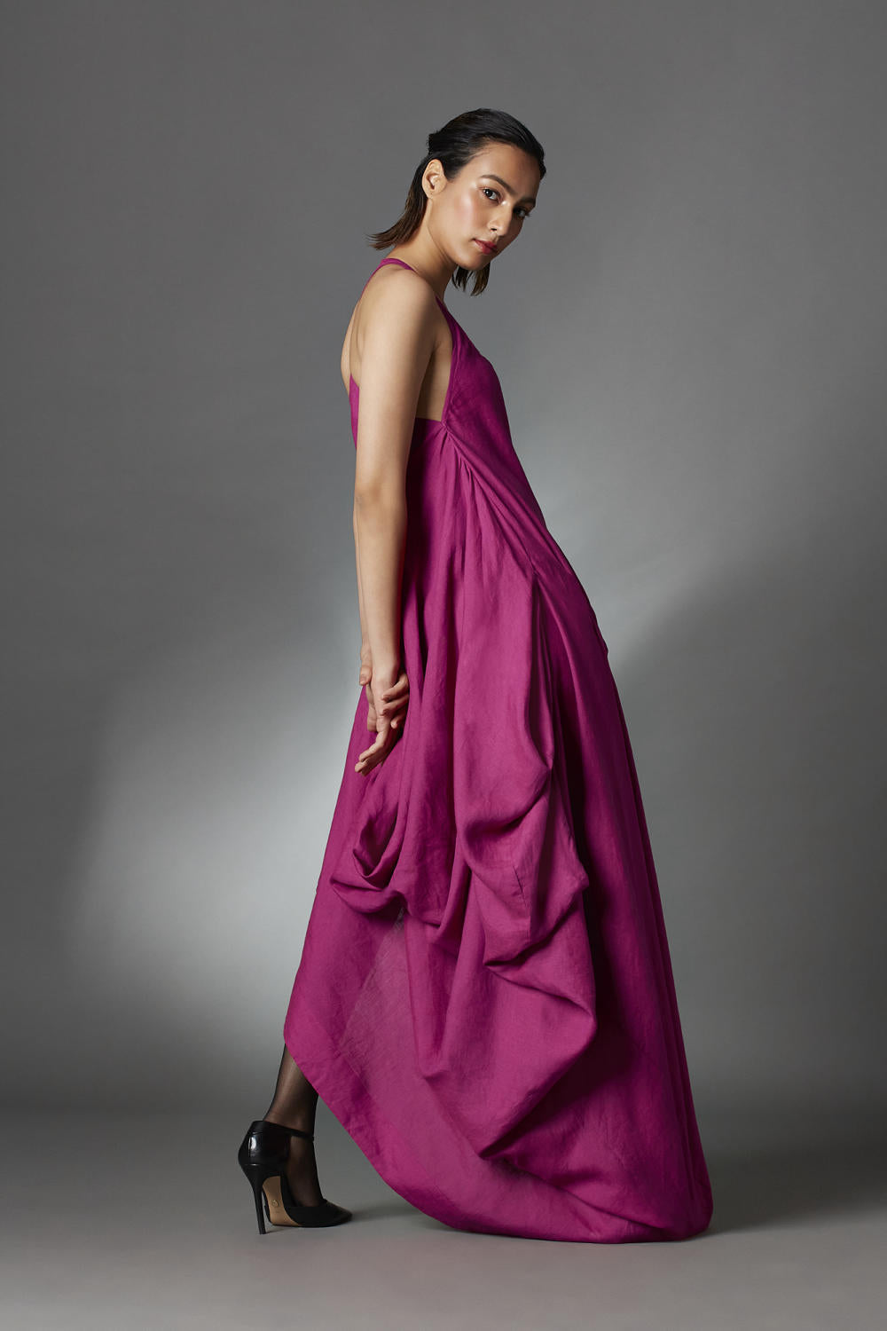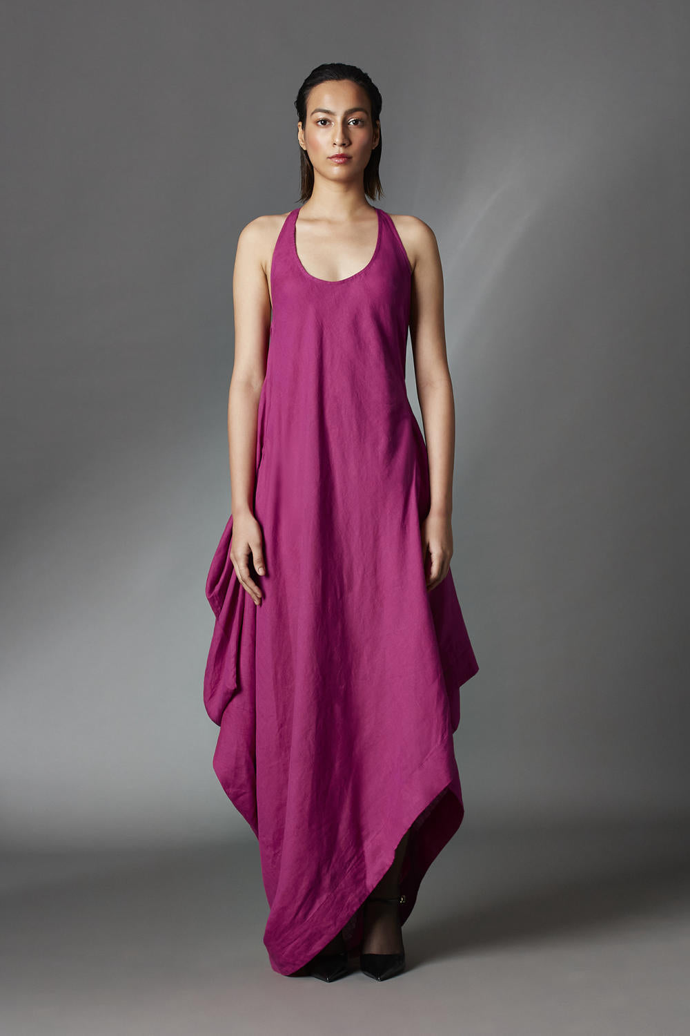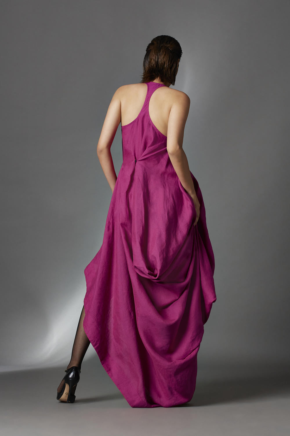 RACER BACK ONE SIDED DECONSTRUCTED DRESS WITH ROUND NECK, CUT POCKETS, PIPING AND LOOP/BUTTON AT THE BACK