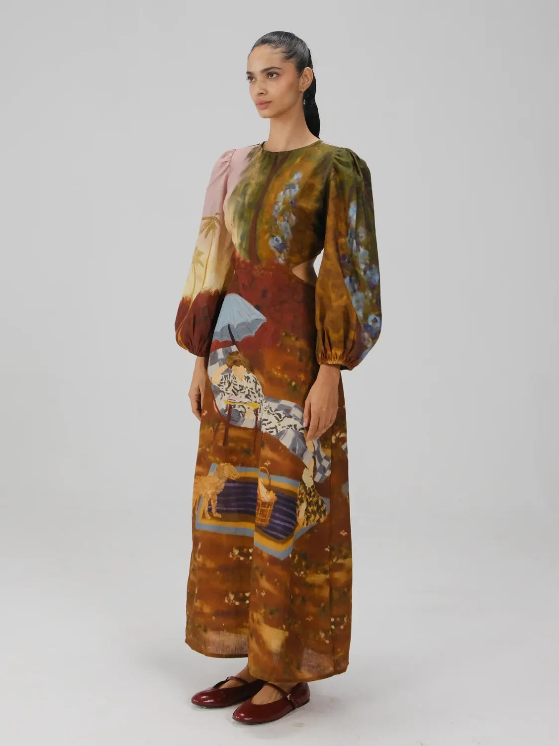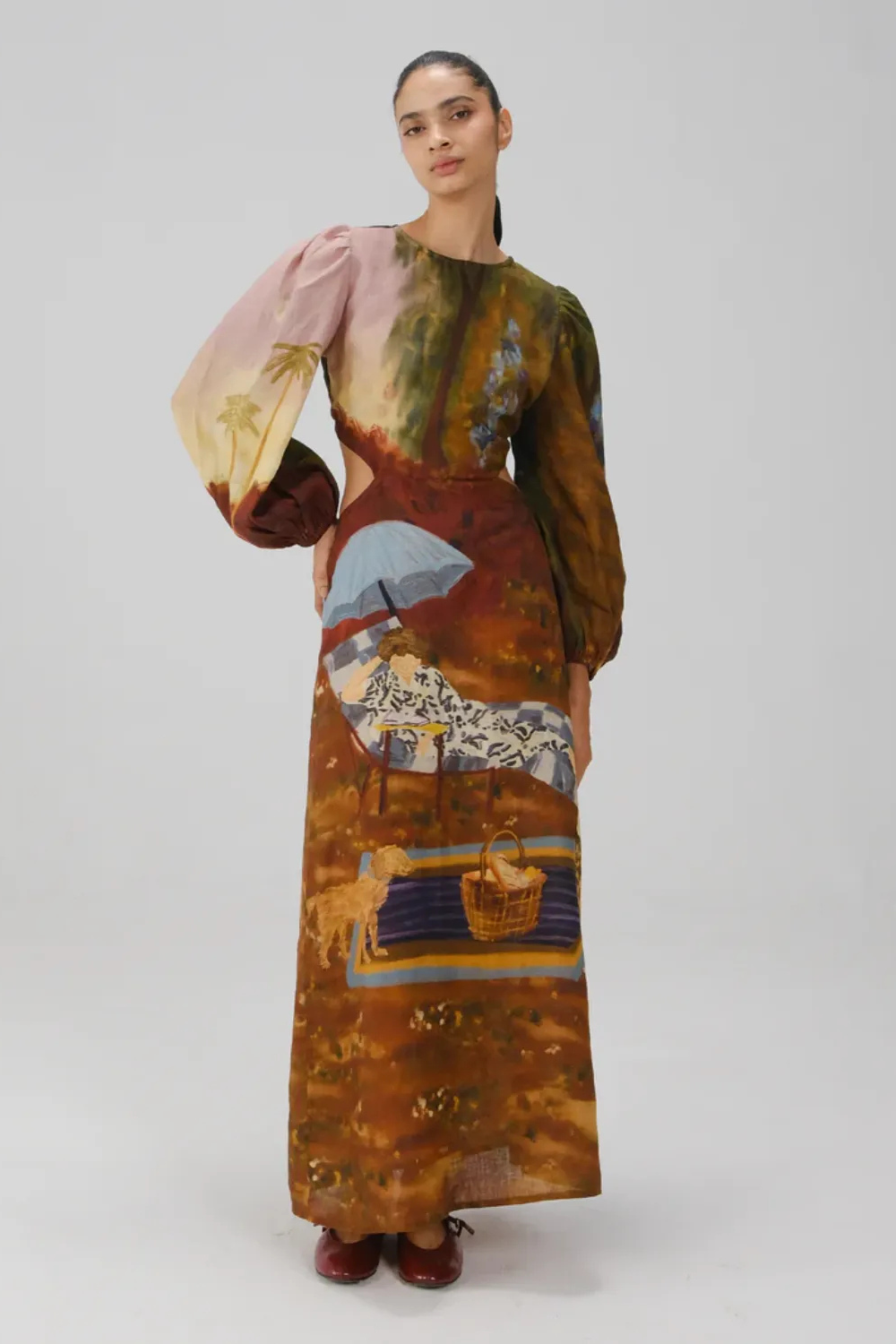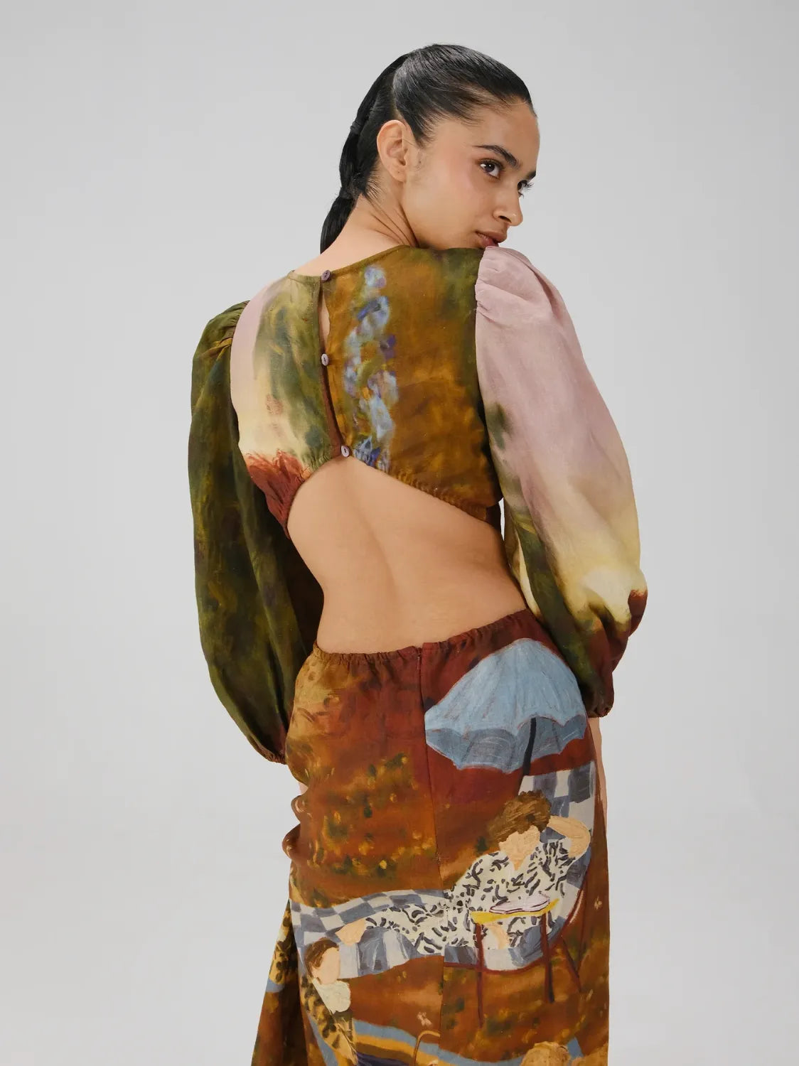 An elongated take on our signature style, crafted from pure linen with a backless design, flared skirt, and gathered sleeves. Its relaxed fit and waist cuts create a breezy, flattering silhouette with effortless charm.