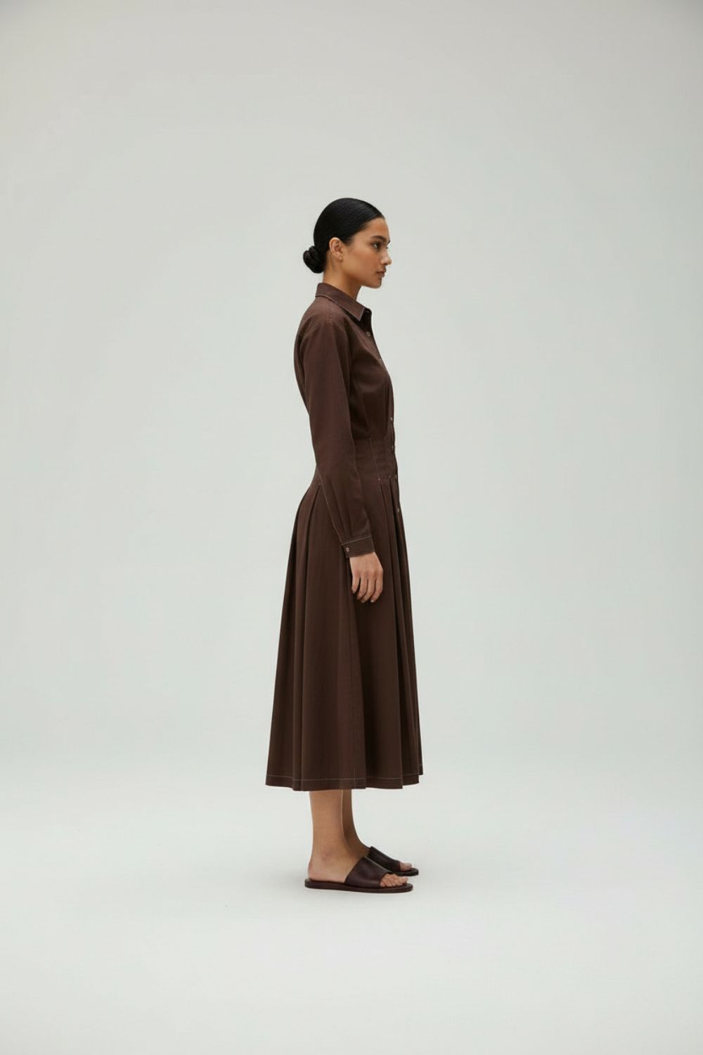 Description: Pleated button down dress tucked along the waistline. The dress comes with side pockets, contrast top stich and bone on cuff
