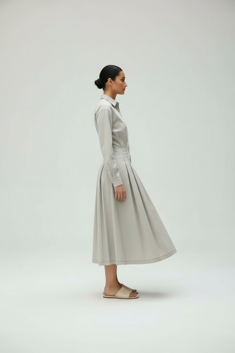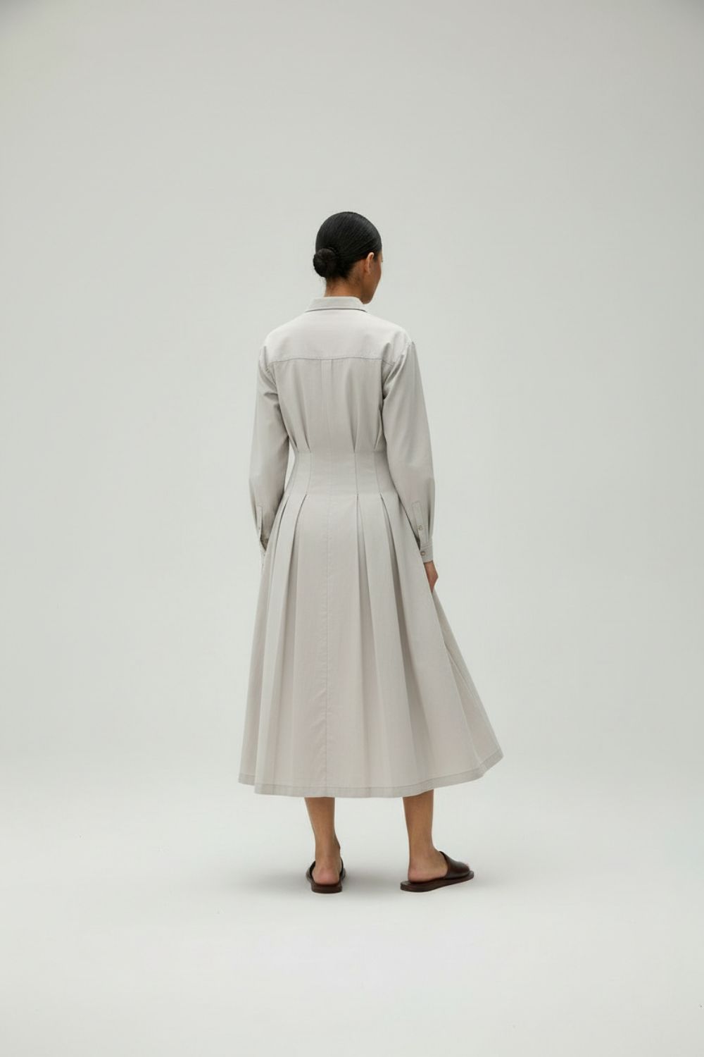 Description: Pleated button down dress tucked along the waistline. The dress comes with side pockets, contrast top stich and bone on cuff