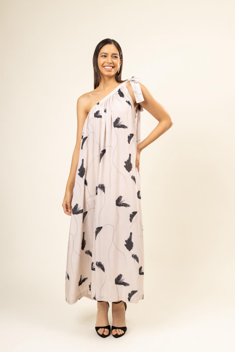 Description: One shoulder gathered dress with tie-up on one side