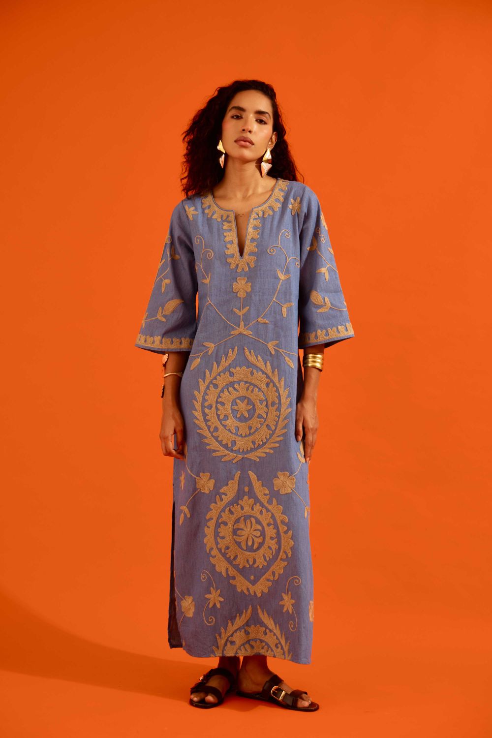 Denim Blue Cotton Maxi Dress with Natural Wave Thread Embroidery