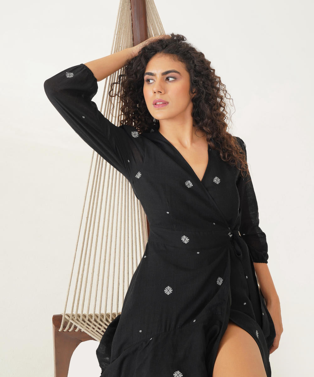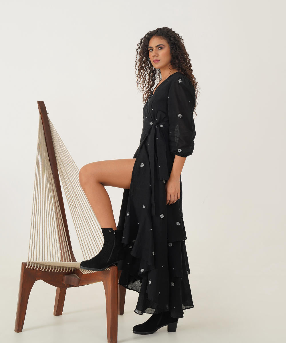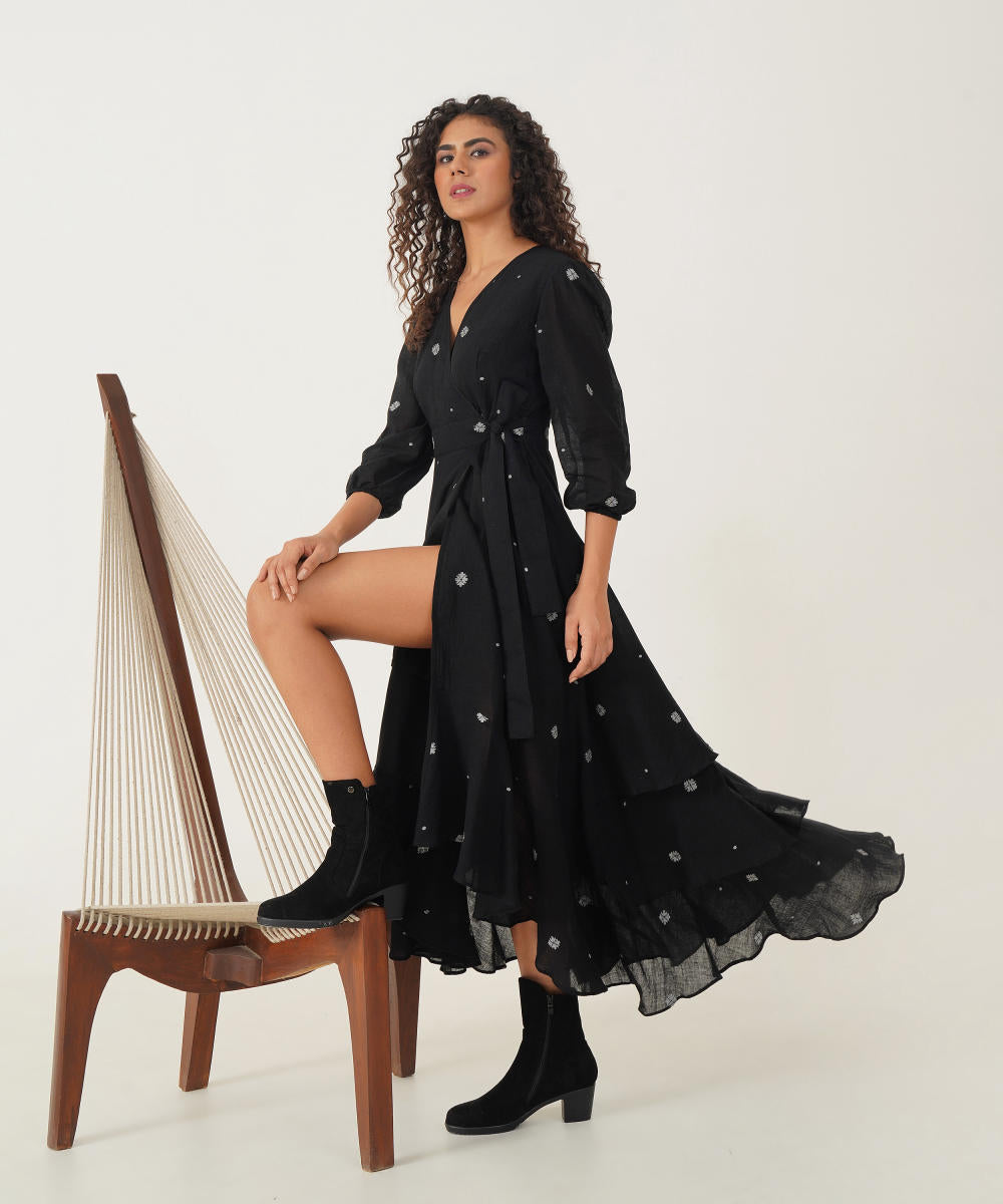 Embrace timeless elegance with our classic wrap dress, designed to impress with its tiered silhouette and graceful movement. The long sleeves, detailed with elastic cuffs, offer a flattering fit, while the tie at the waist cinches the dress for a perfect, personalised shape. The asymmetric ruffled hem adds a dynamic flair, flowing beautifully with each step. For added versatility, this dress also includes an additional slip, ensuring a smooth, comfortable foundation.