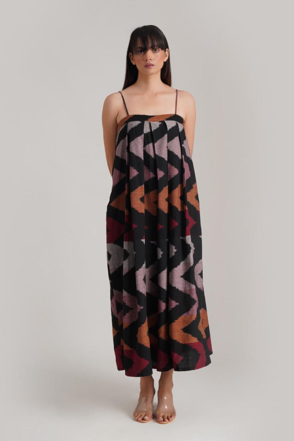 Dress up in this classic ikat dress featuring a noodle strap, knife pleats, and back zipper fastening that is designed to be styled in multiple ways.