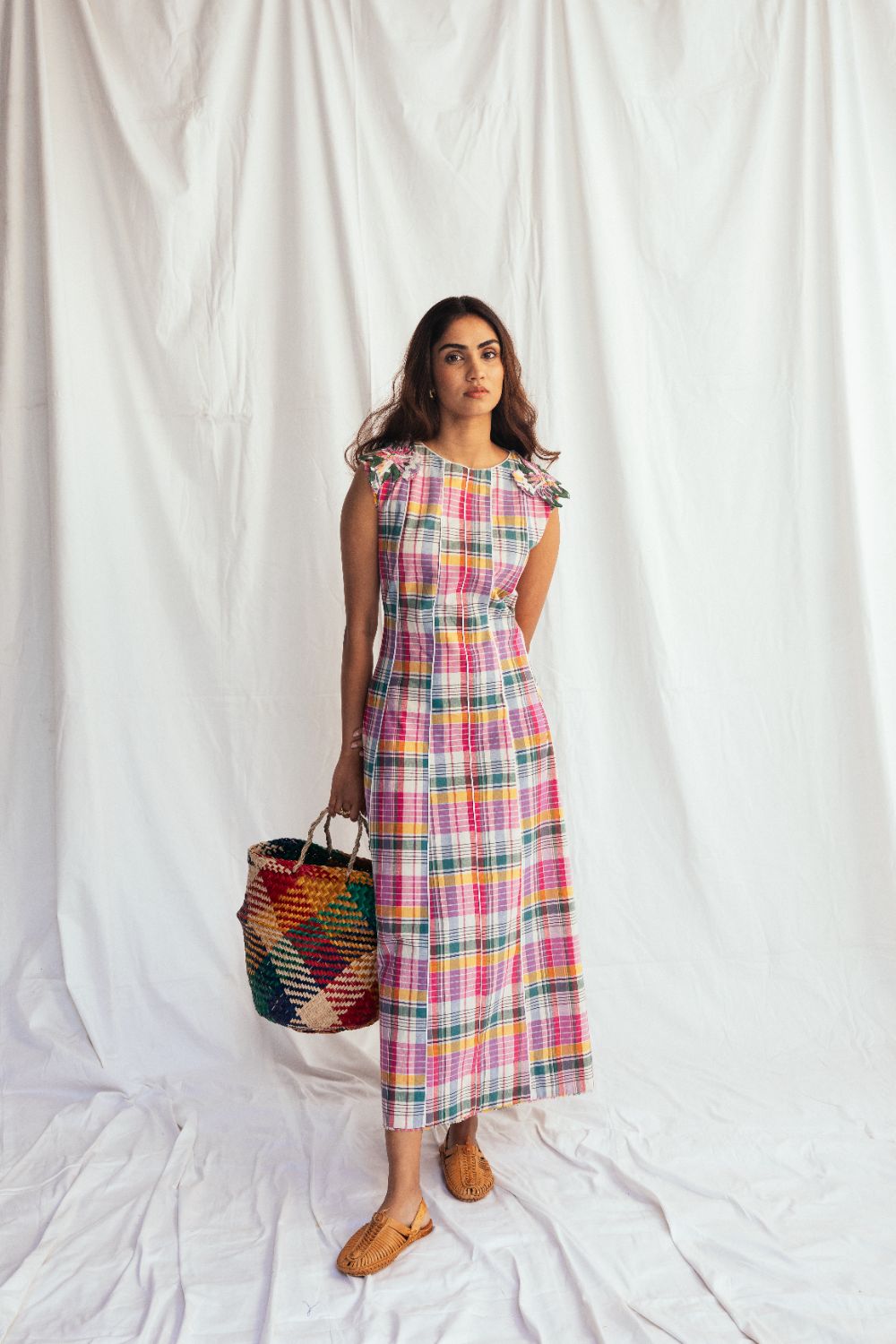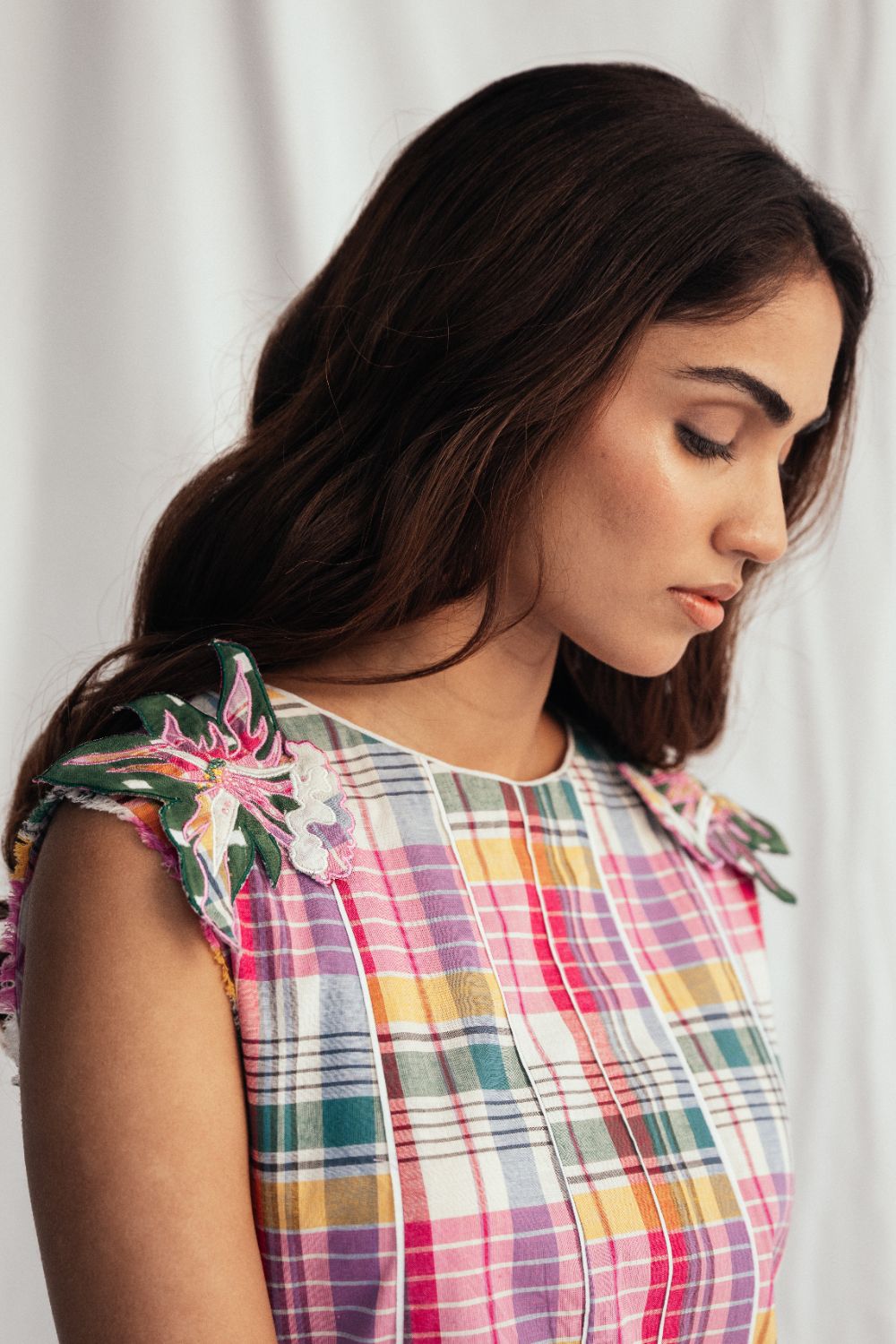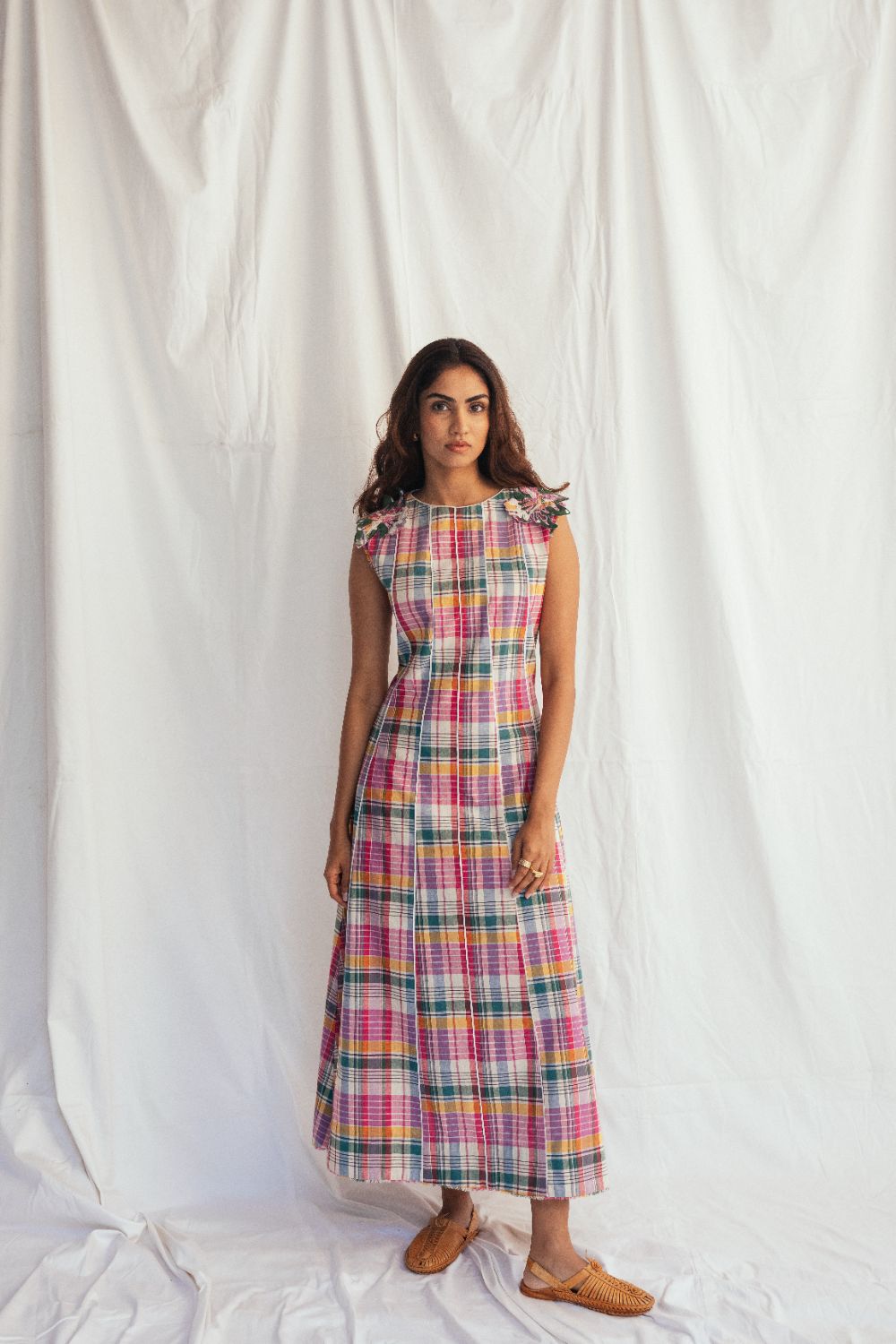 A panelled midi dress ,crafted in handwoven cotton with contrast white piping. The silhouette is elevated by floral appliqué patches on the shoulders and a raw, ripped-effect finish at the hem and armhole.