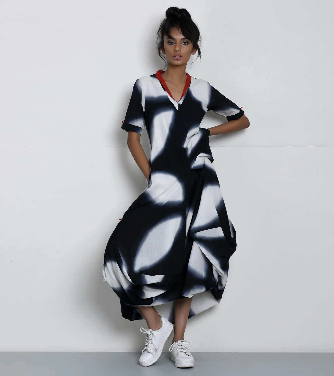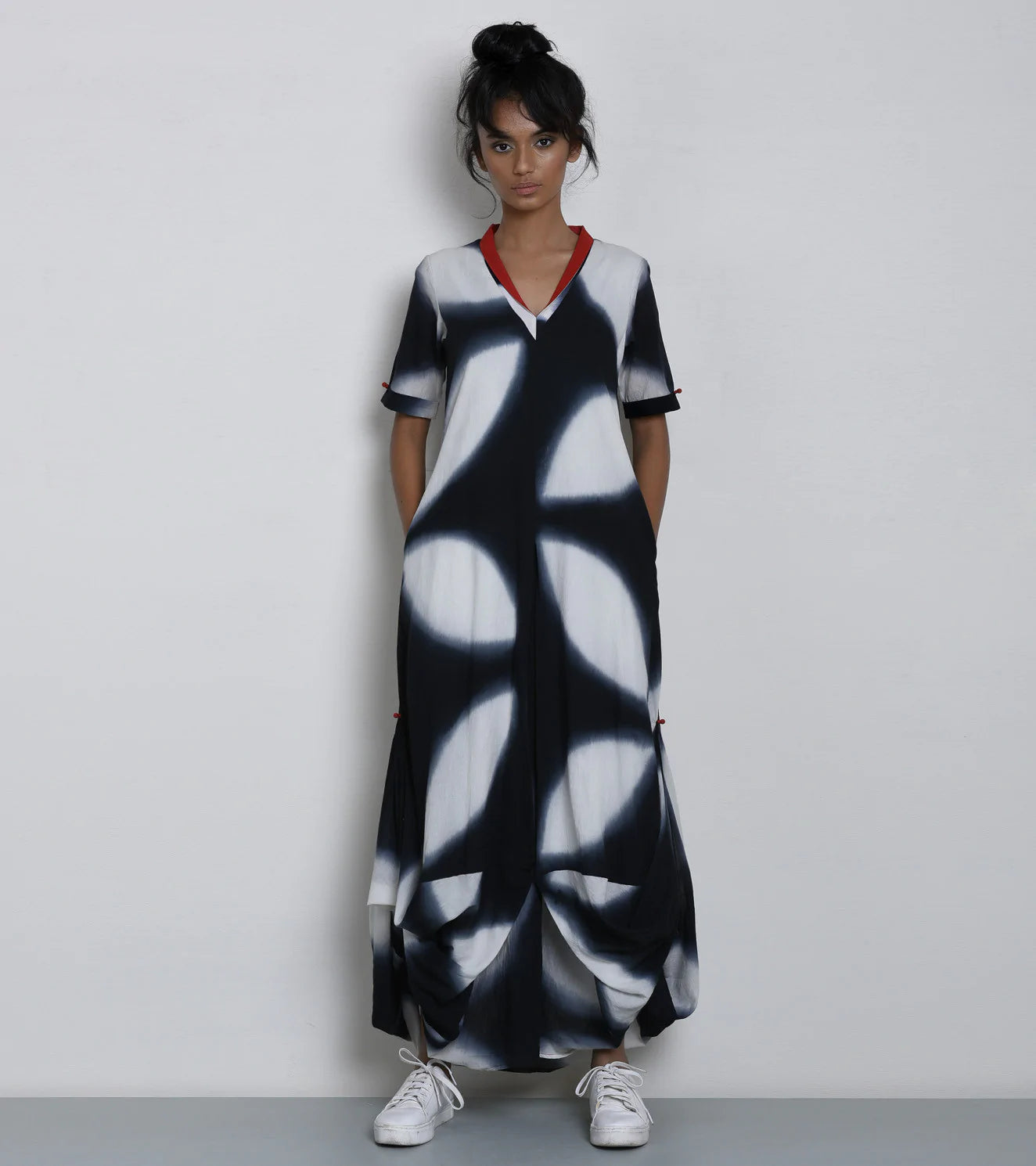 When the rain stops, sometimes all I want to do is lie on the highest terrace top in this city and gaze at the clouds. A black and white shibori dyed, handloom cotton maxi dress in our signature silhouette. Features a red collar panel and red button detailing with side tucks and side pockets for dreamy weather.