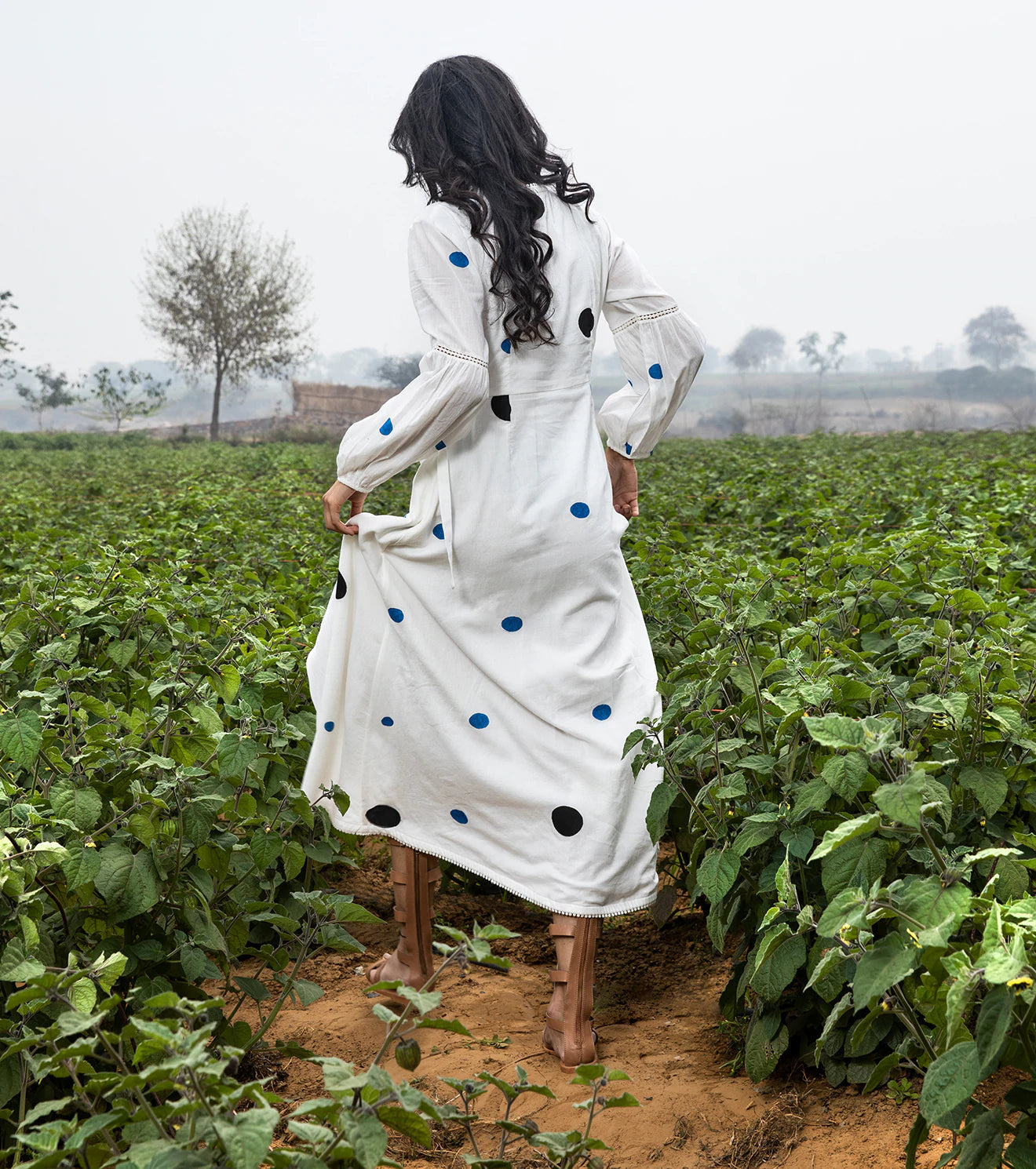 A mulmul midi dress with full sleeves, a surplice neckline, side tie-up belt, and block-printed polka dots all over.