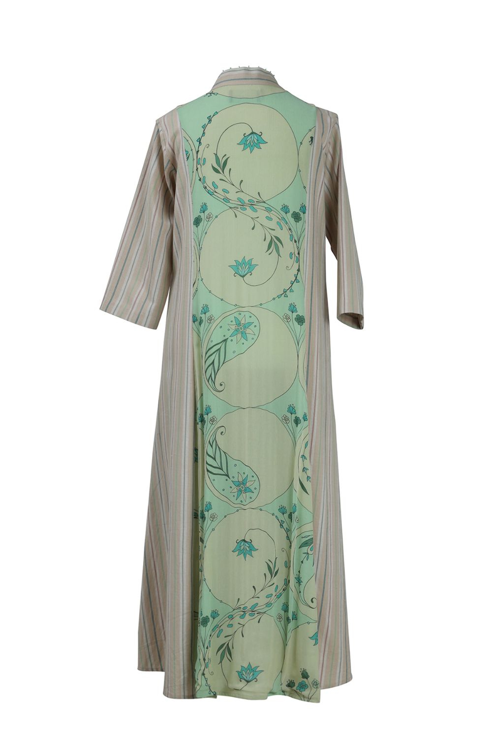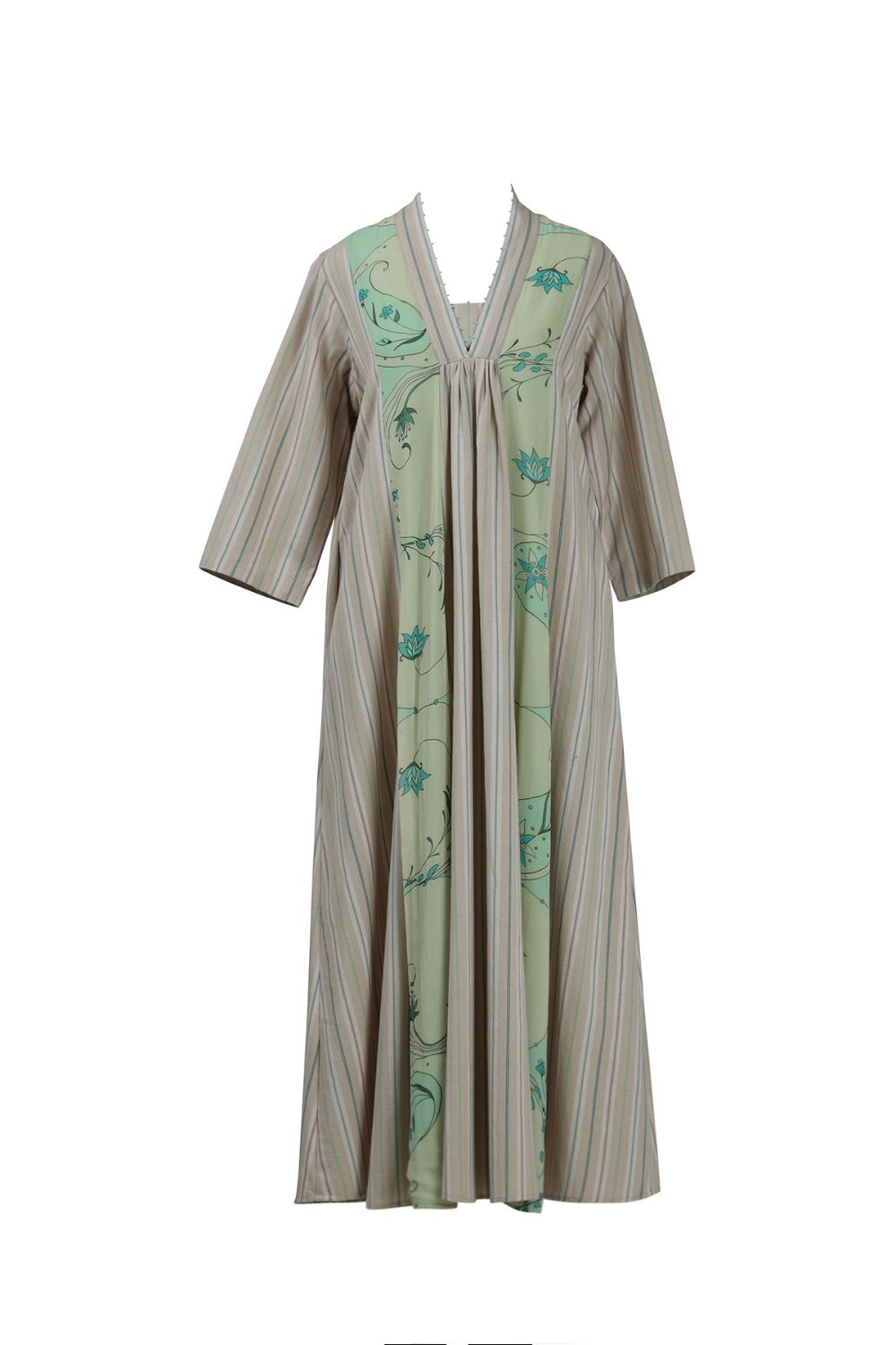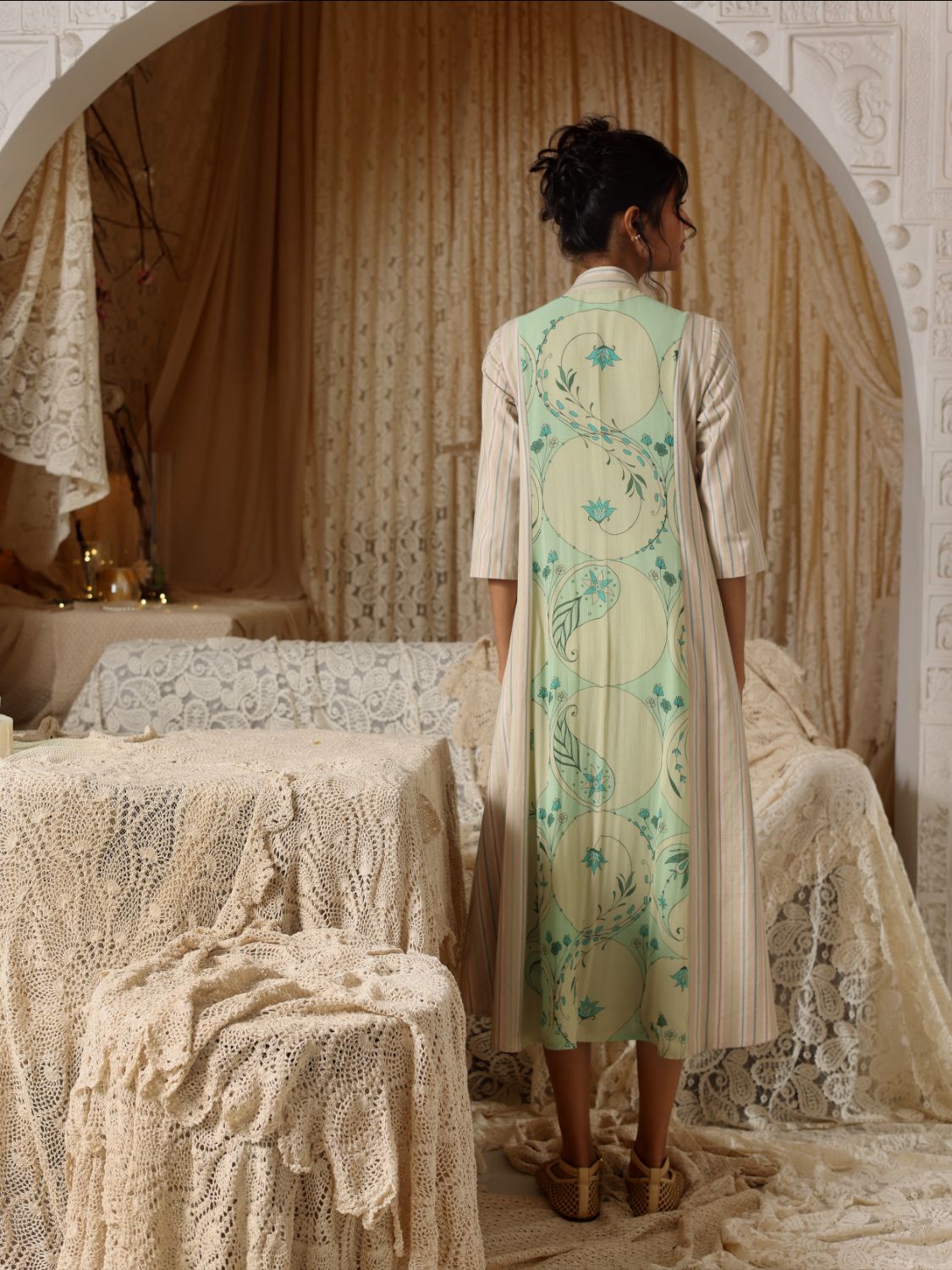 Fresh and flowy, this tunic-style A-line dress is a thoughtful mix of fabrics and prints. The body features delicate mint circle floral chiffon, while the stitched V-neckline and accents are crafted in contrasting striped cotton, creating visual balance and structure. Lightweight and breathable, it’s perfect for warm-weather explorations, monsoon city escapes, or leisurely lunches by the sea. A subtle statement with a modern twist.