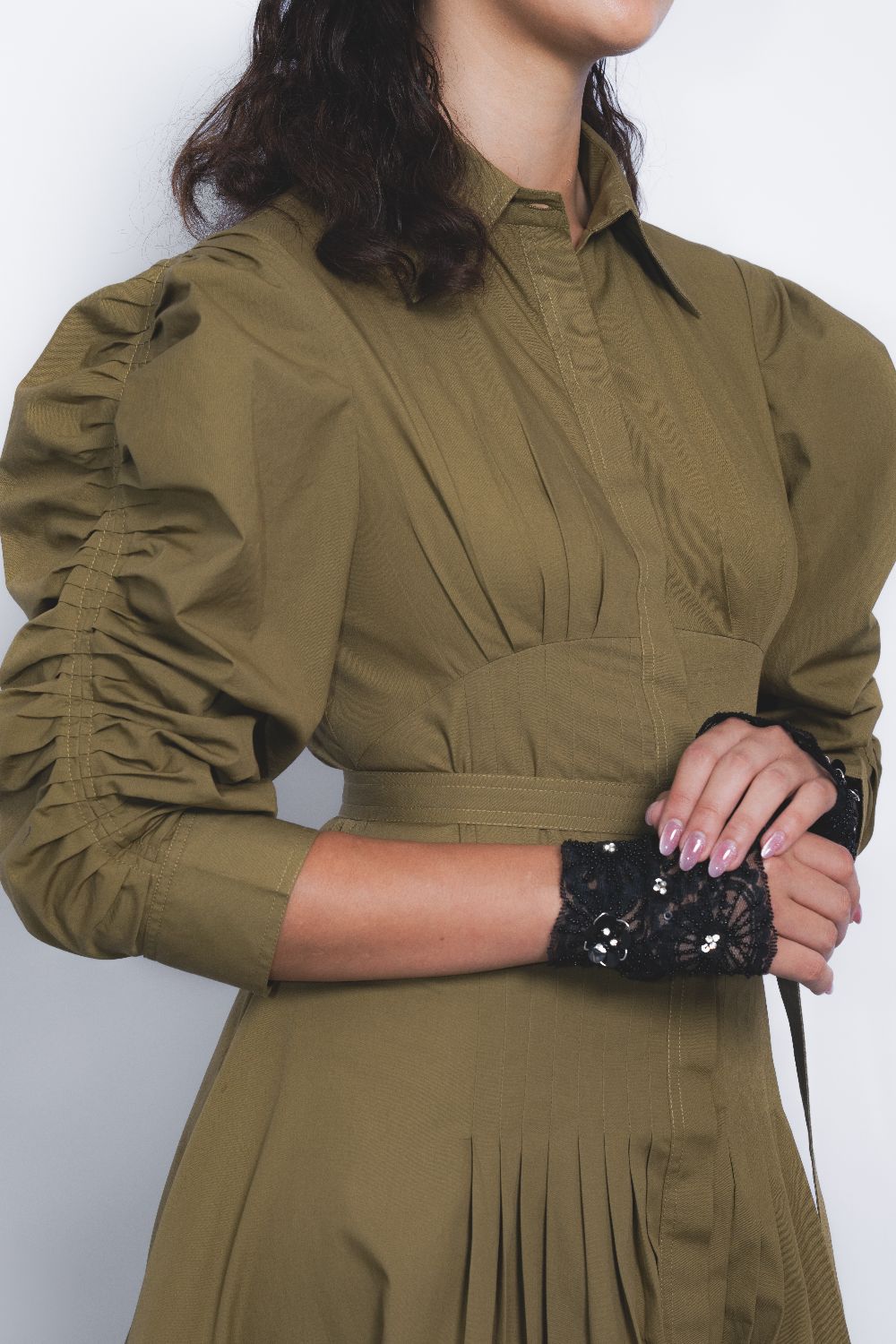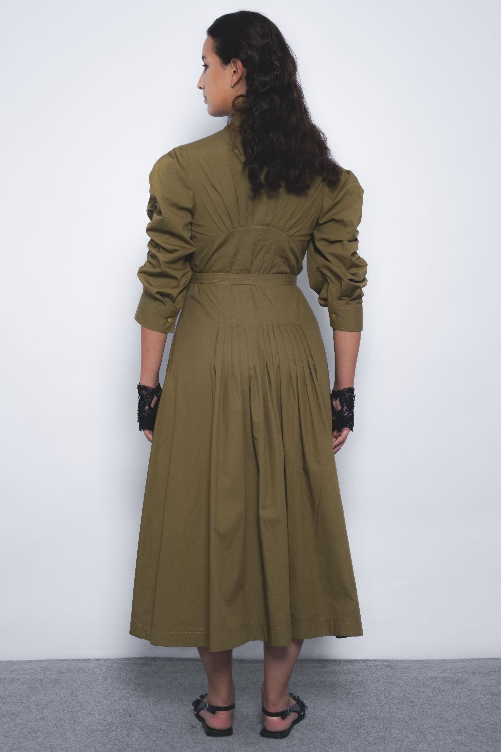 This silhouette features intricate textile manipulation that contours the body, with pleating extending to the waistline before unfolding into a voluminous hem. The design balances a soft, feminine shape with a commanding presence, heightened by the strength of its color.