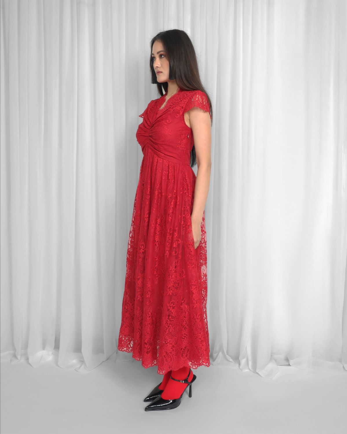 This elegant lace midi dress has a pleated front bodice , cap sleeves and plunging neckline. Softly pleated at waist to create a sensuous silhouette, with scalloped edges on sleeves and bottom skirt. Model height is 5'8" Model wear size S garment length is 50"