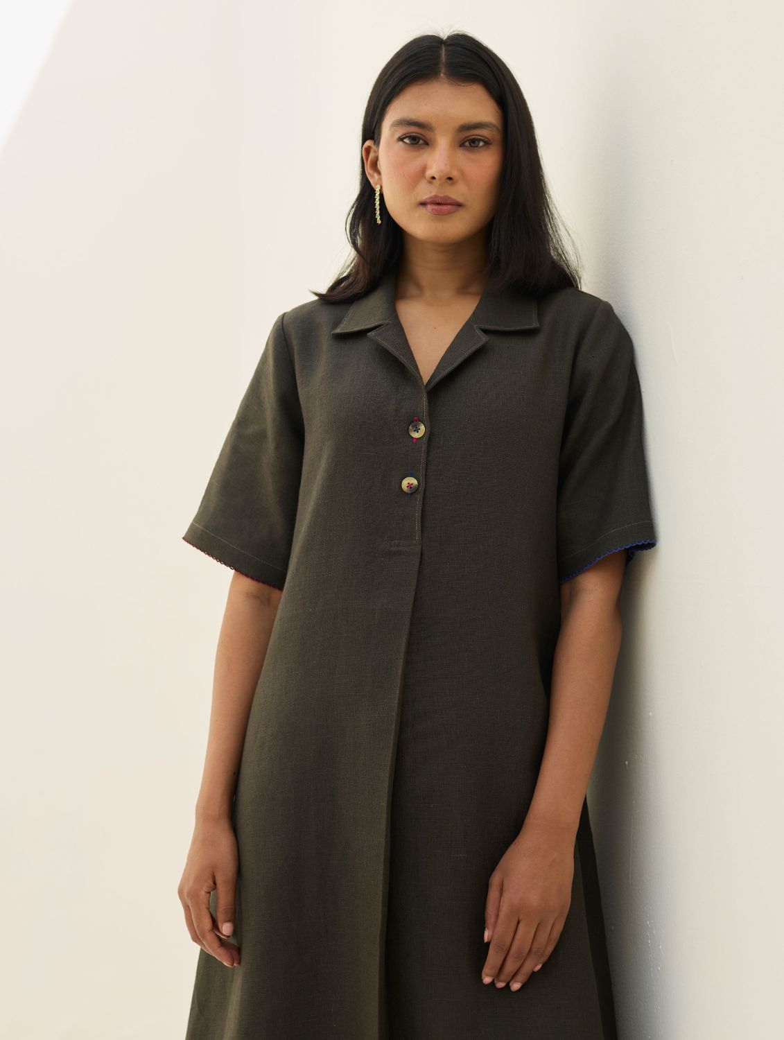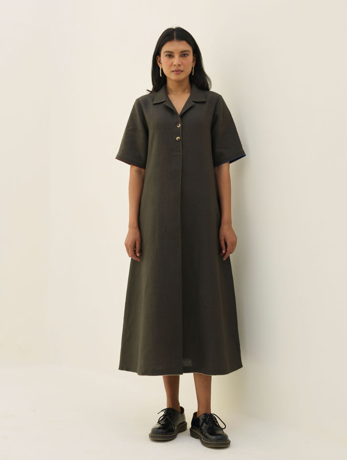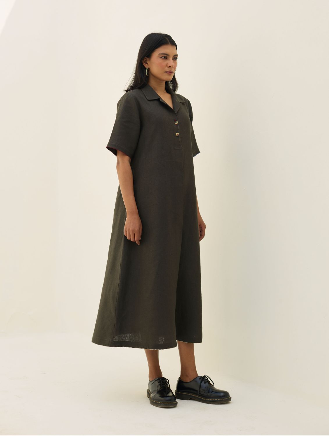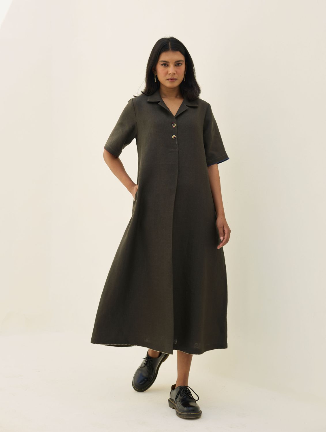 Aster is a half-sleeve, A-line dress crafted in our custom 200 gsm yarn-dyed linen that is ideal for autumn/cooler temperatures. Designed with relaxed, effortless charm, Aster features a cuban collar and a front button opening, enhanced with a centre knife pleat that introduces gentle flare and movement. Delicate picoting details trace the edge of the sleeves and hem, offering a subtle contrast, while the buttons are finished in contrast colours. Added side pockets bring comfort and everyday ease, making Aster a versatile silhouette that transitions seamlessly from casual days to more formal evenings.