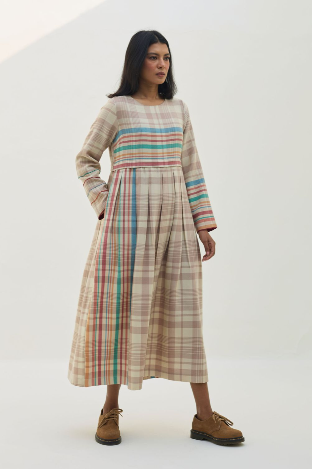 Our favorite Fiona dress is designed in our yarn-dyed pure merino wool woven as two-toned checks, woven with a vibrant multi-colored striped border. The dress has intricately placed box pleats at the waistline, a soft boat neckline, wool-lined side pockets for comfort and ease and a single button opening at the back. The sleeves are finished with contrast-coloured delicate picoting and edged with subtle contrast piping. A dress that can be worn across seasons/occasions.