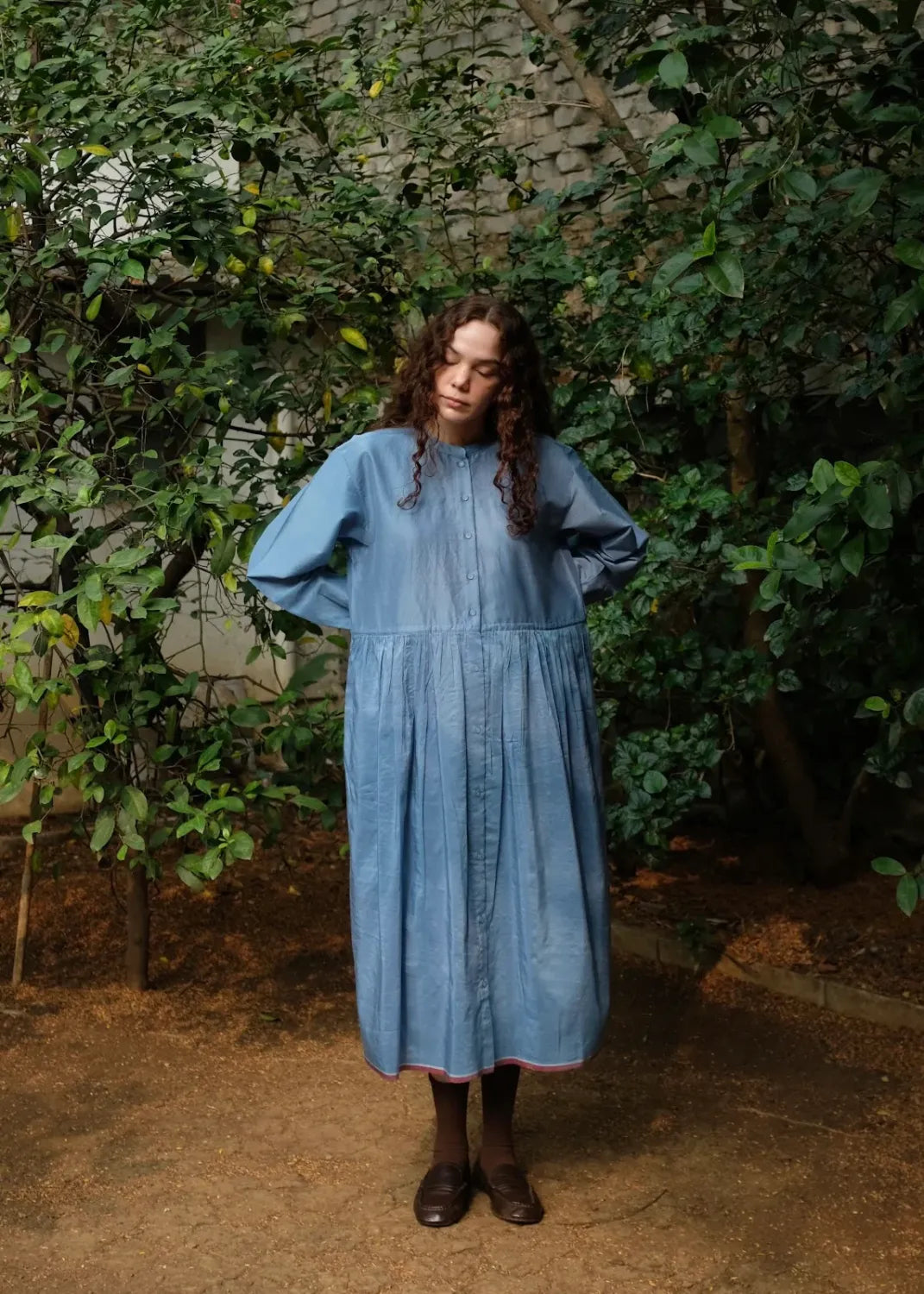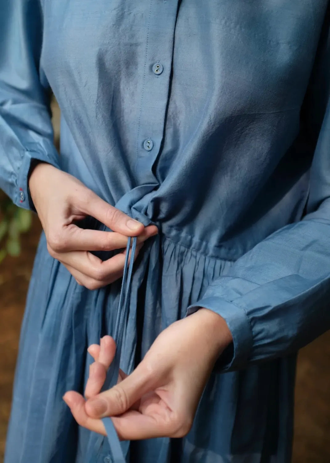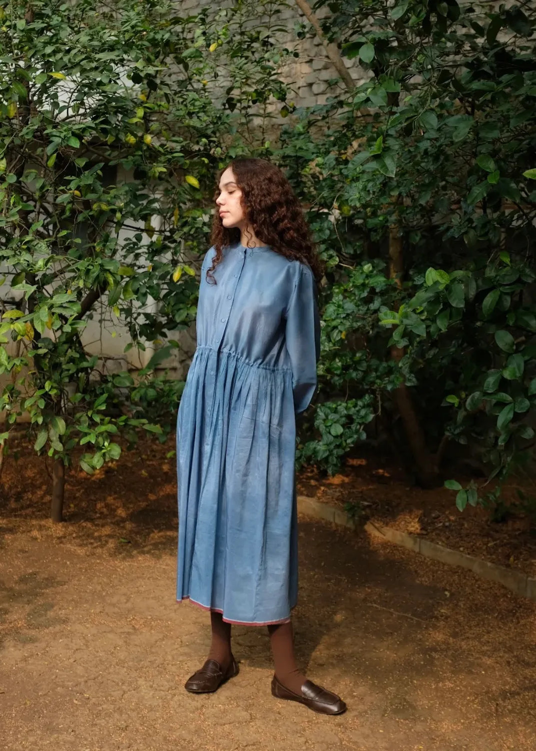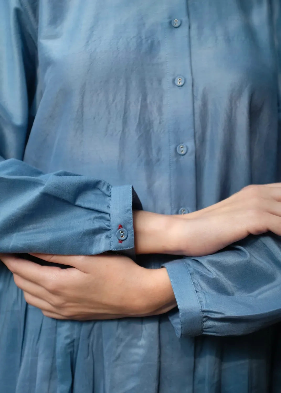 A quiet, considered dress defined by subtle details. A concealed belt softly cinches the waist, shaping the silhouette without interruption. Sleeves fall into gentle gathers, finished with cloth buttons at the cuff. A Chinese collar and a clean placket extend uninterrupted to the hem, lending the piece a calm, elongated line. The dress borrows it's aesthetic from Japanese style -- we often refer to it as the 'Japan Dress'.
