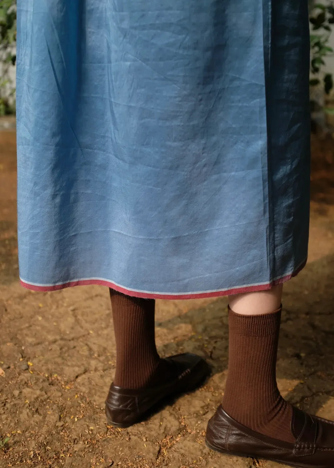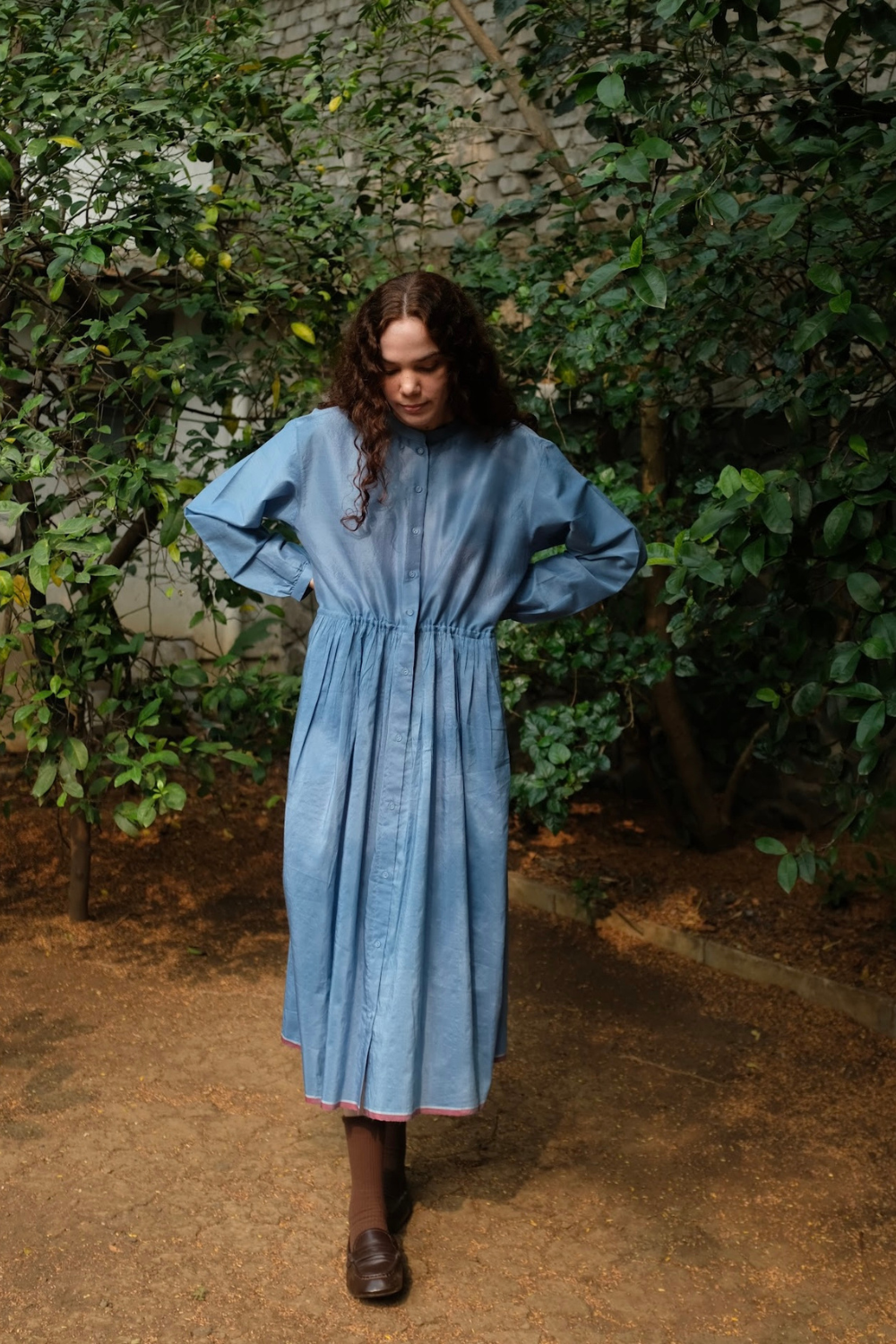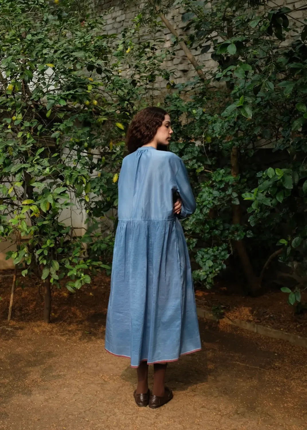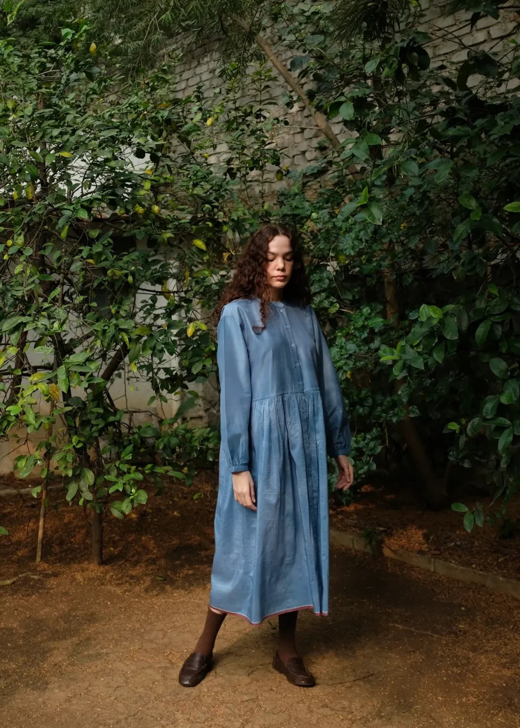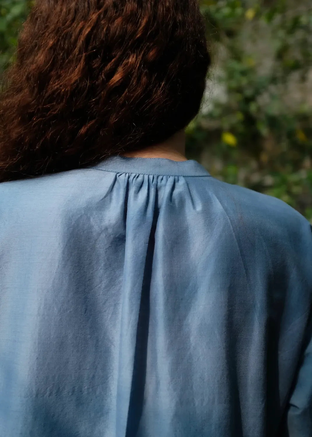 A quiet, considered dress defined by subtle details. A concealed belt softly cinches the waist, shaping the silhouette without interruption. Sleeves fall into gentle gathers, finished with cloth buttons at the cuff. A Chinese collar and a clean placket extend uninterrupted to the hem, lending the piece a calm, elongated line. The dress borrows it's aesthetic from Japanese style -- we often refer to it as the 'Japan Dress'.