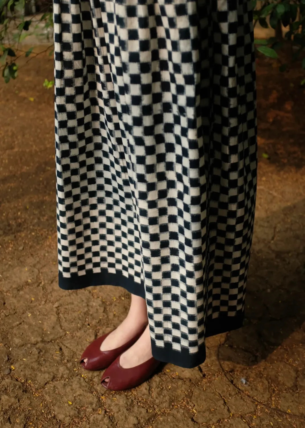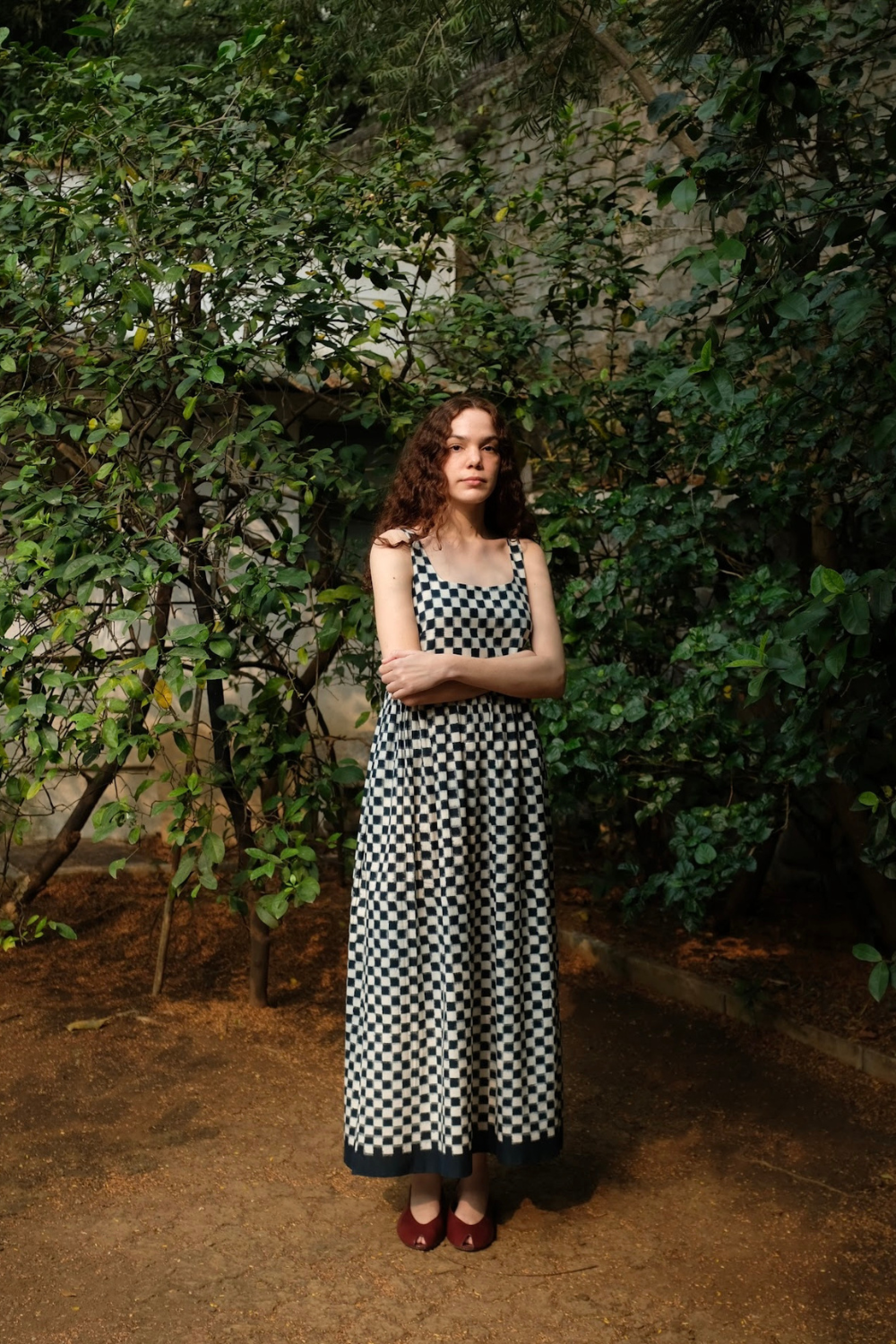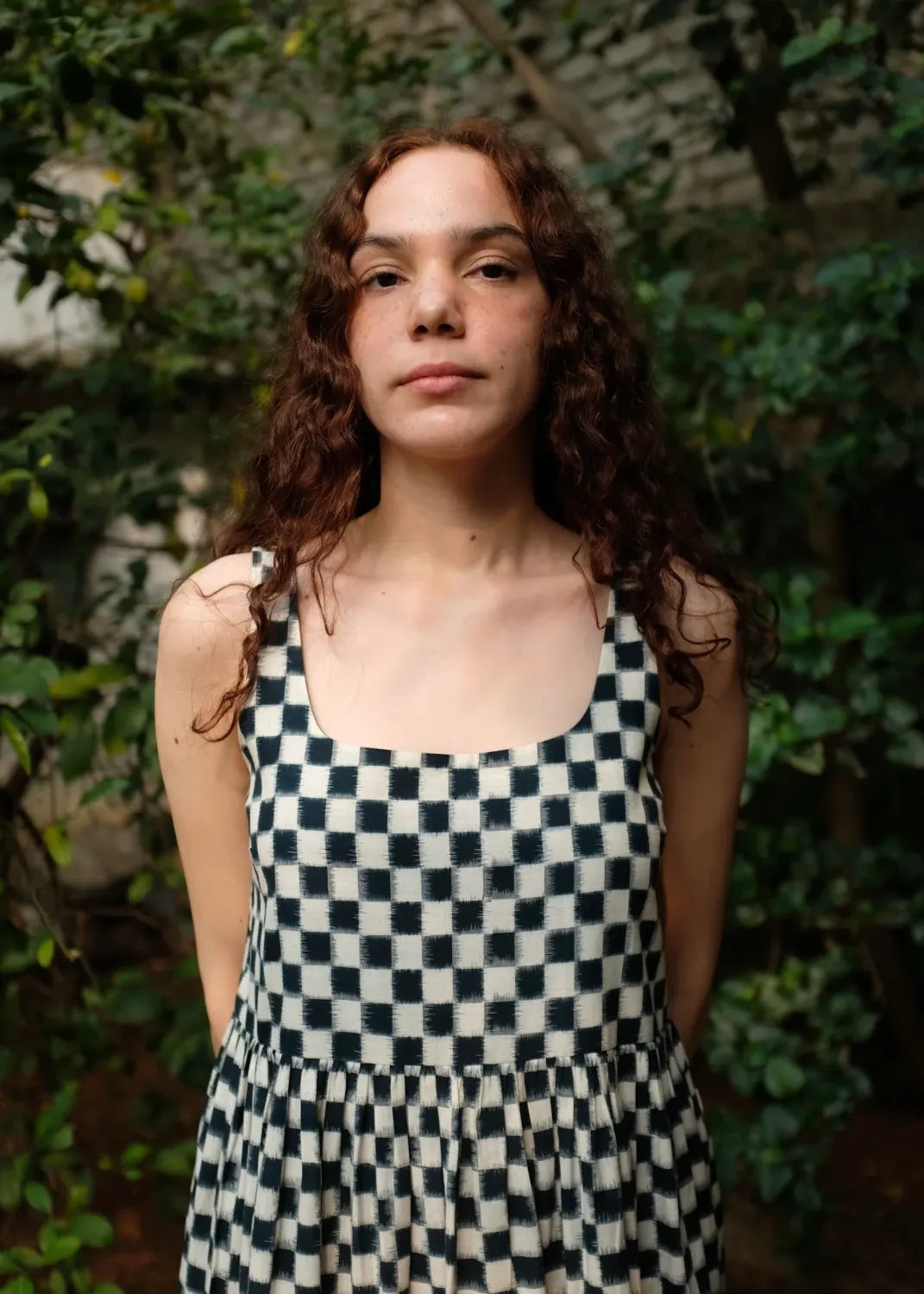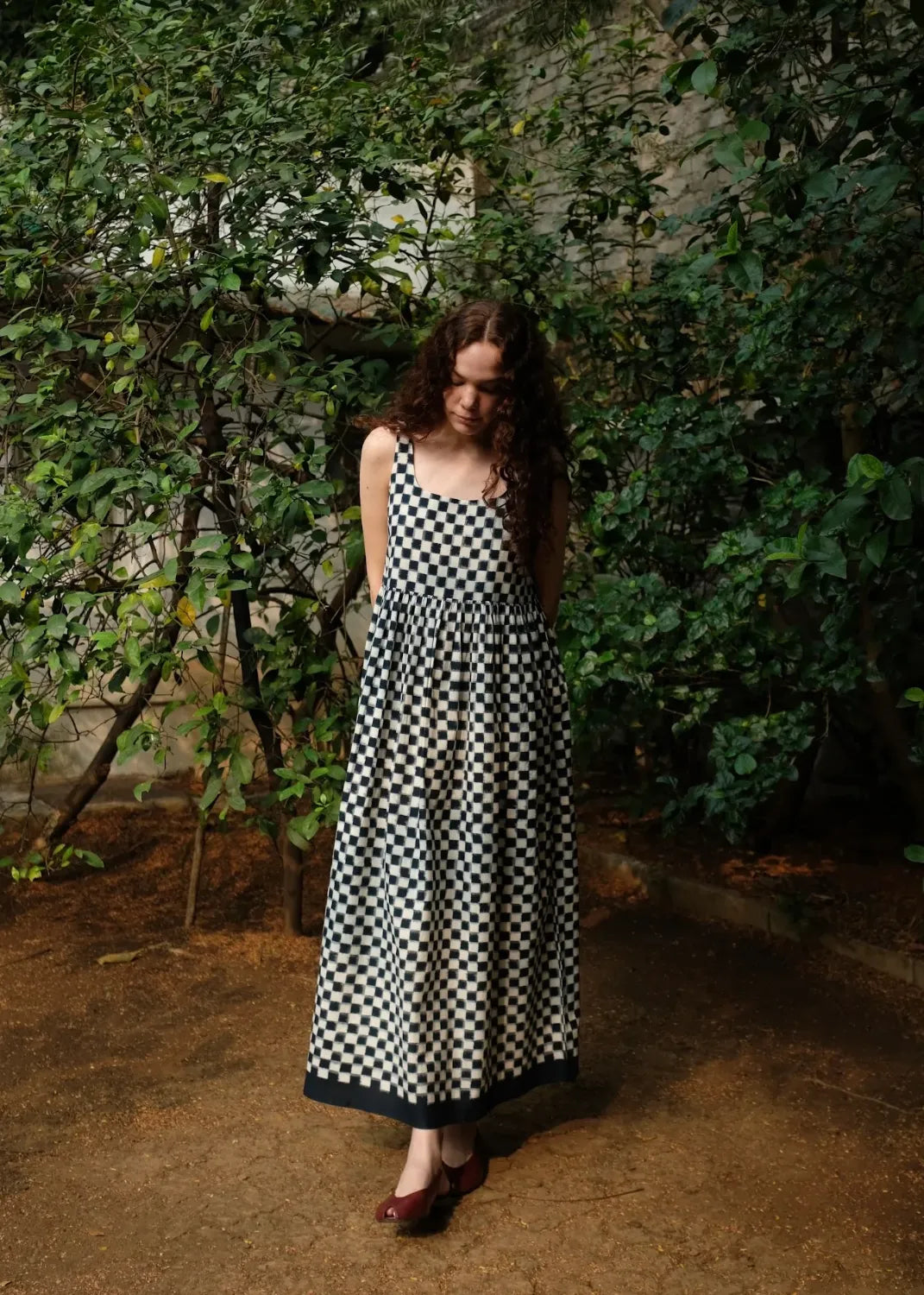 A slight tweak to our classic ‘Mia’ dress, this time with lesser volume but a more striking textile - handwoven cotton double ikat. A sleeveless cotton midi that comes with a slightly fitted bodice elasticated at the back, and gathers that run down the waistline and end in a thick solid indigo selvedge. The dress fastens with a concealed zip on one side.