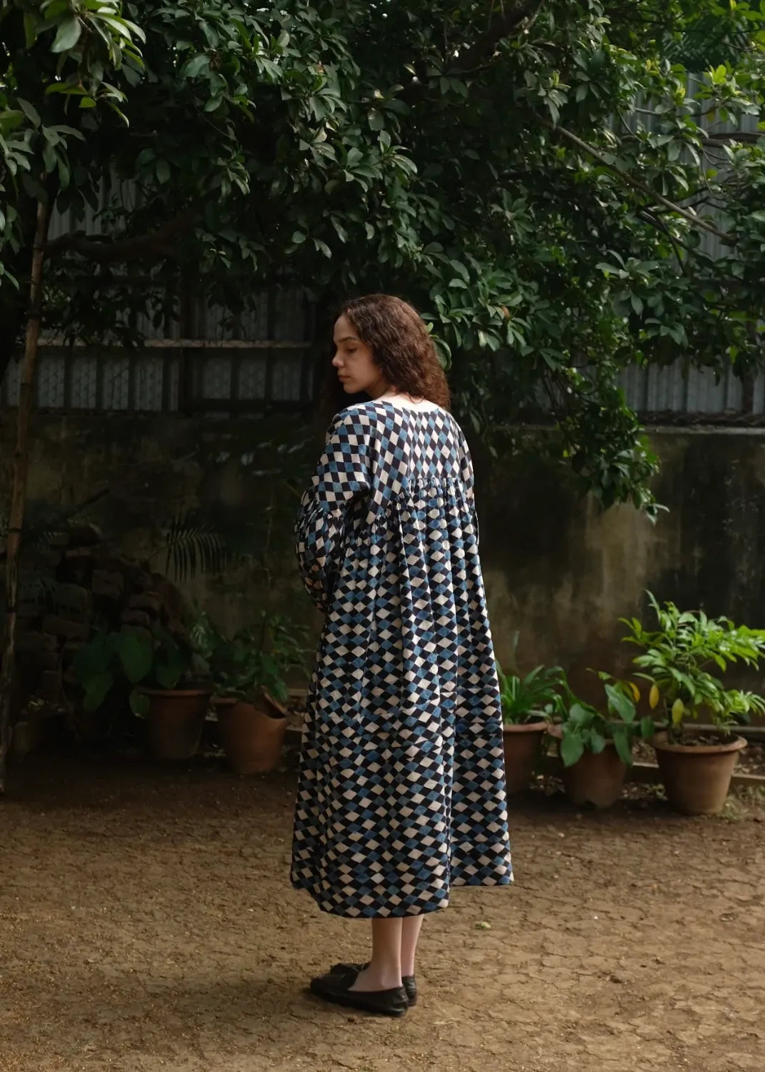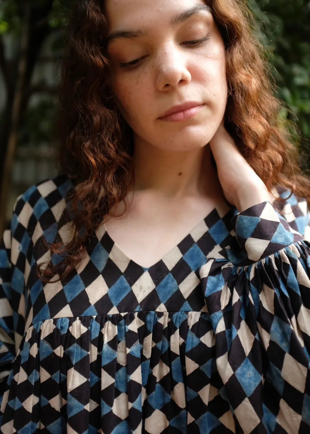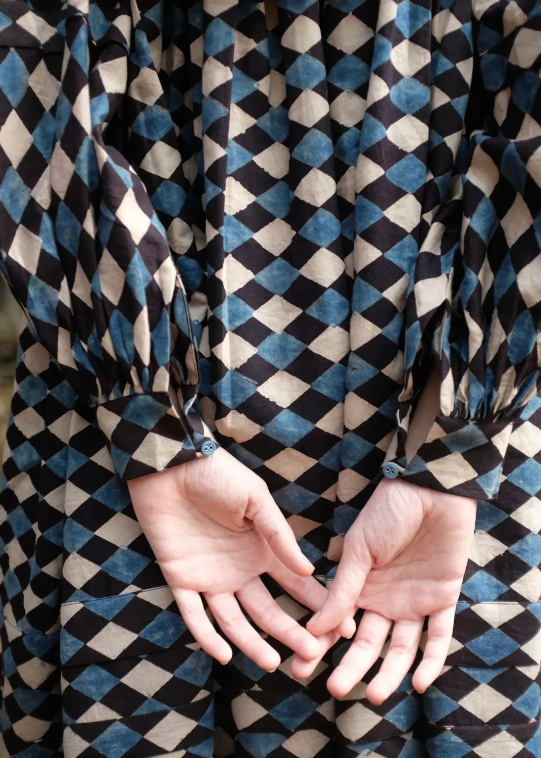 A fresh new print in our bestseller, 'Irisa' - the perfect voluminous dress cut in a handwoven - handprinted soft cotton silk textile, with exaggerated sleeves and a V neck.