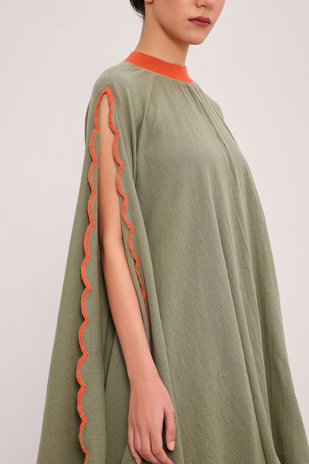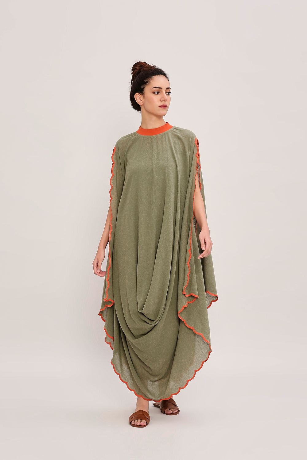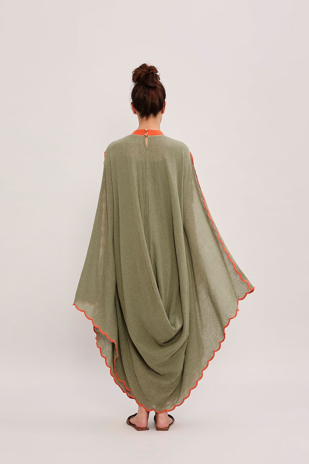 Draped cowl tunic in textured handwoven cotton with a contrast ribbed collar and embroidered scallop edges. Features a waist-defining belt, back button closure, and includes a matching inner and contrast belt.