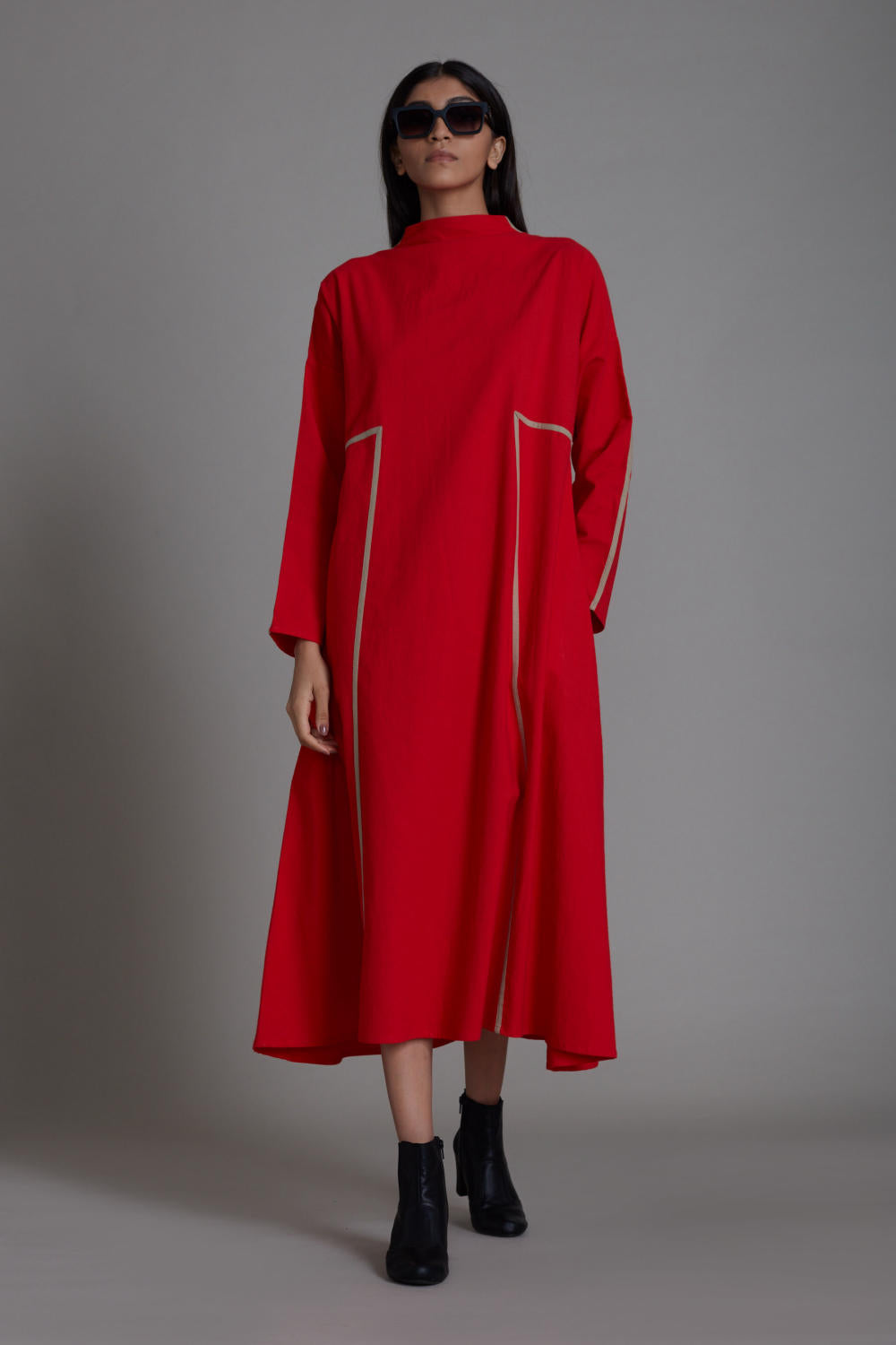 Ankle-length full sleeves dress with high neck, side pockets, and piping detail.