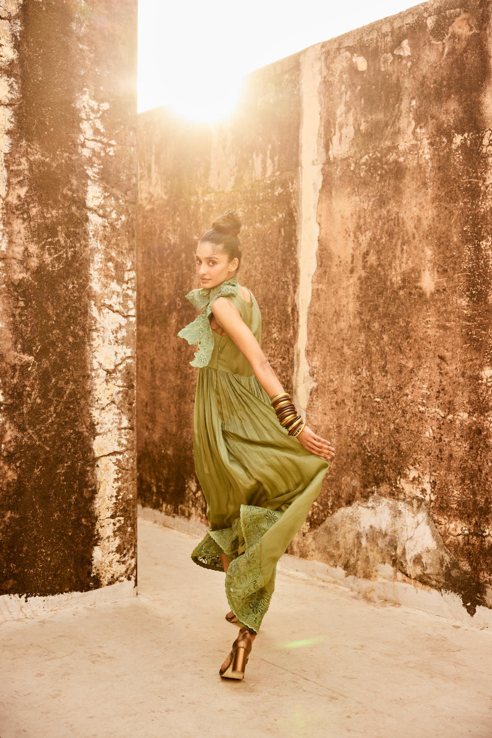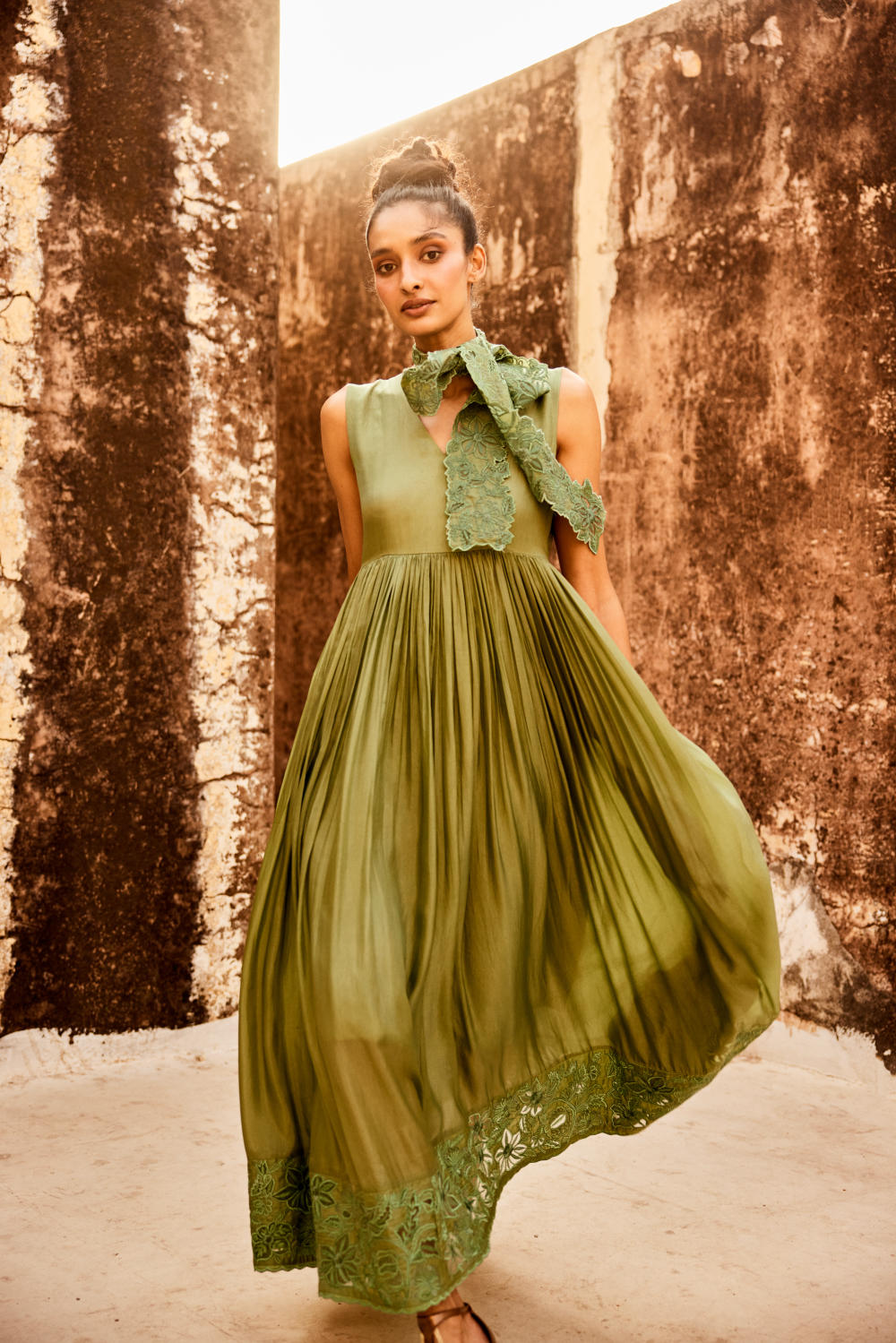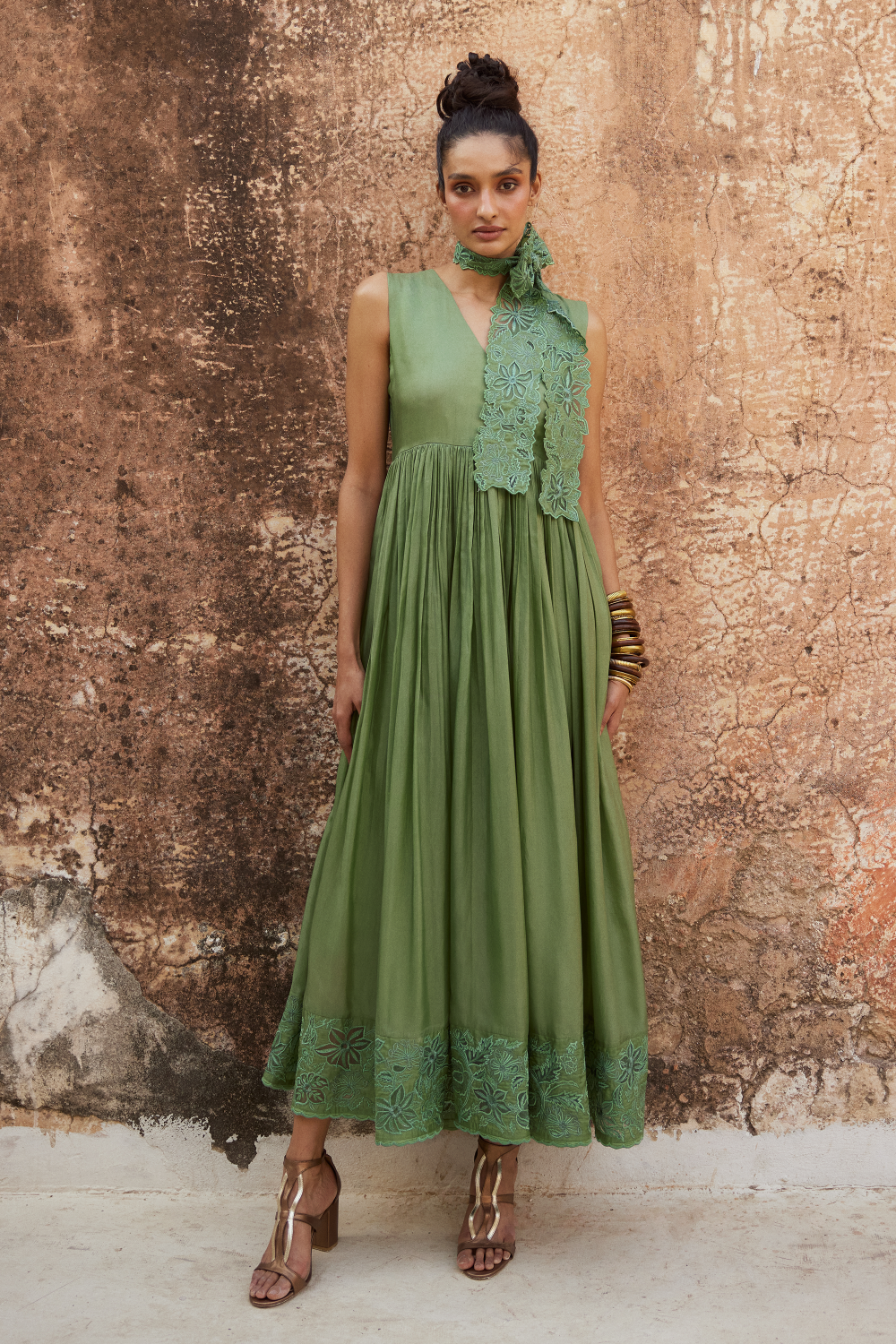 Our chic sage green maxi dress is crafted in silk organza. It has a V neckline with lots of gathering details for an easy and flowy fit. It has an eye catchy cutwork technique details, it is paired with broad waist belt which you can style as a scarf.