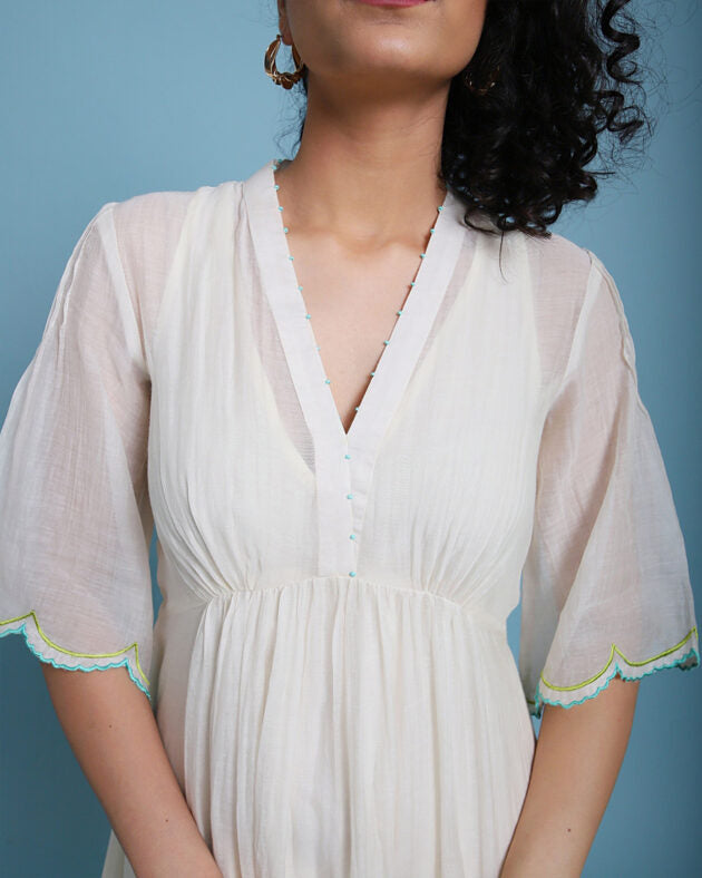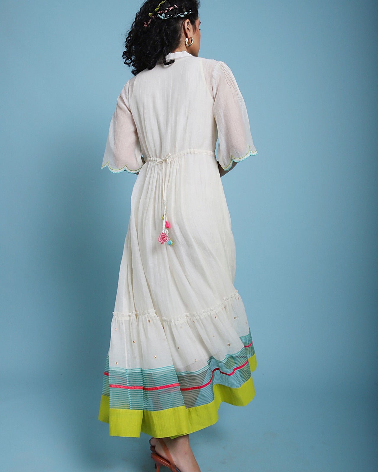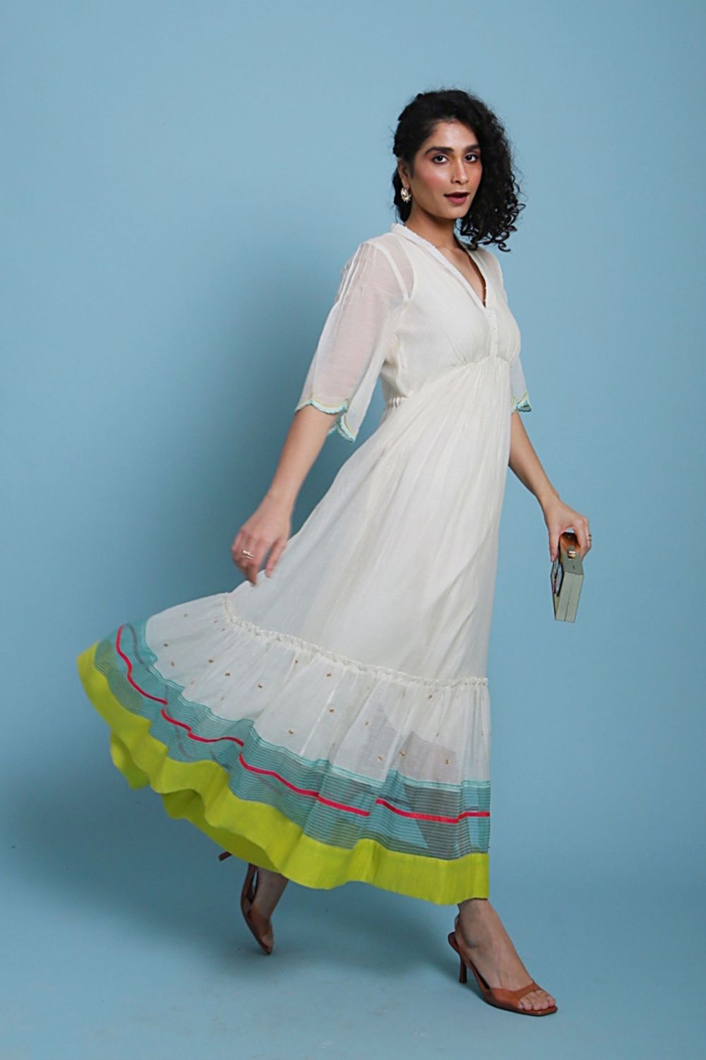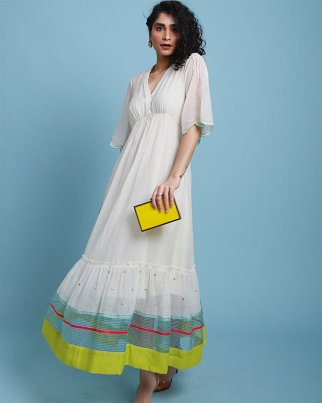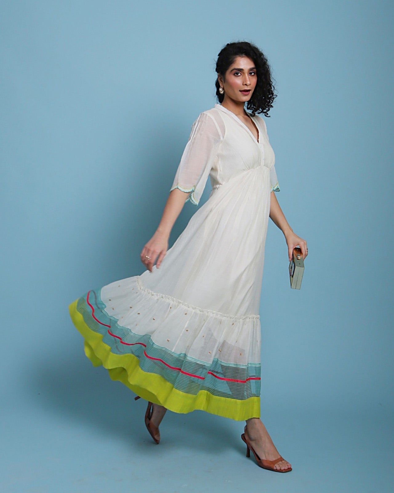 Ivory Chanderi Tiered Dress with blue and yellow panel. Detailed with embroridered sleeves.