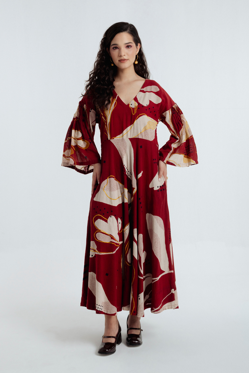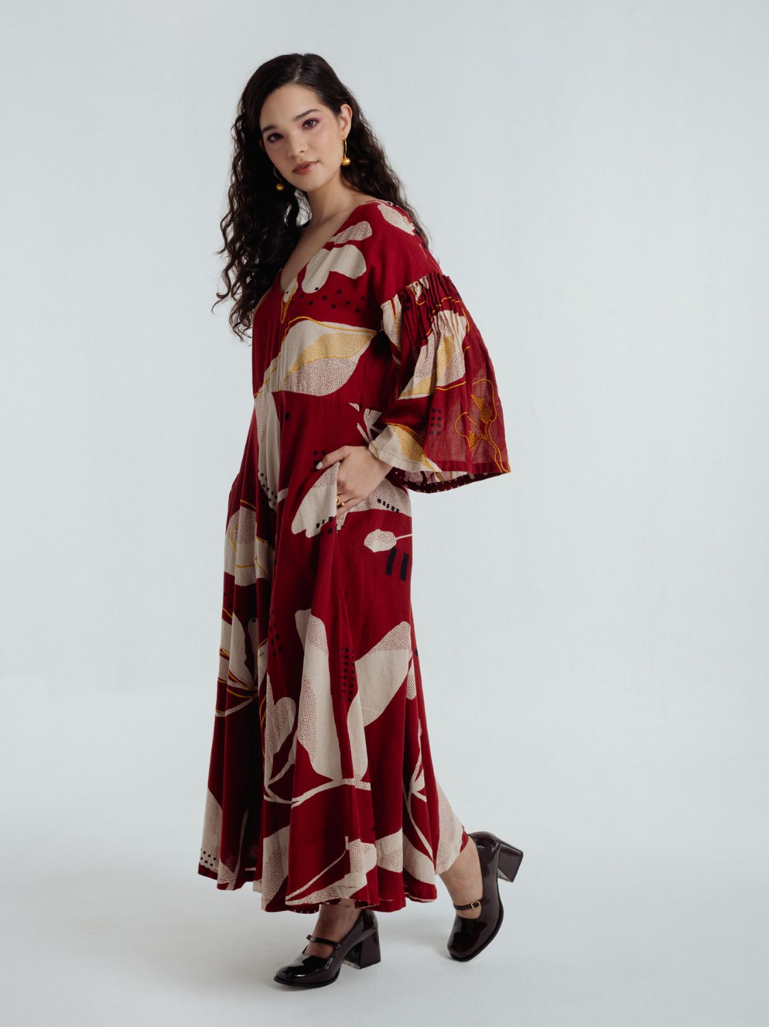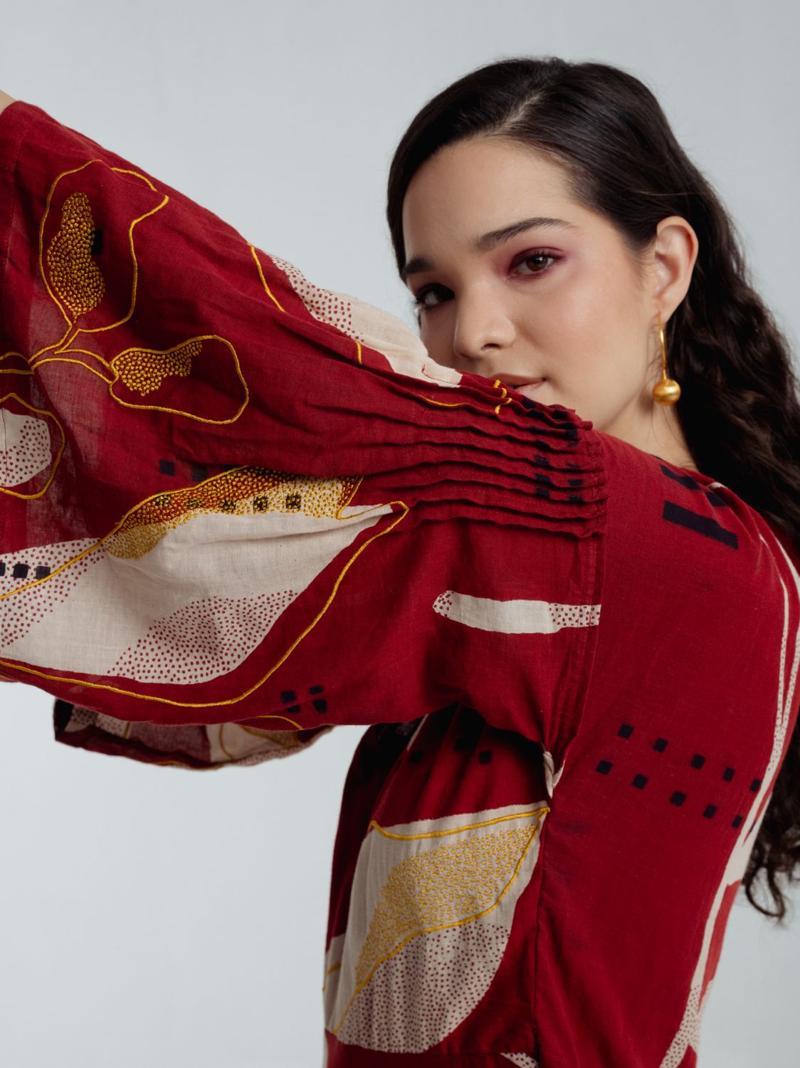 Discover Fayra—an enchanted garden woven in the finest handspun cotton from West Bengal, naturally dyed in deep maroon and black.