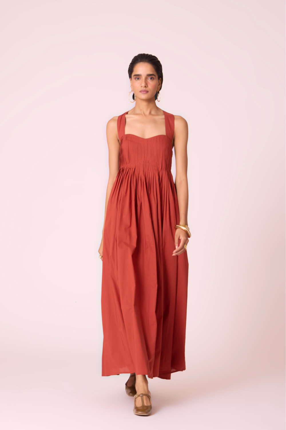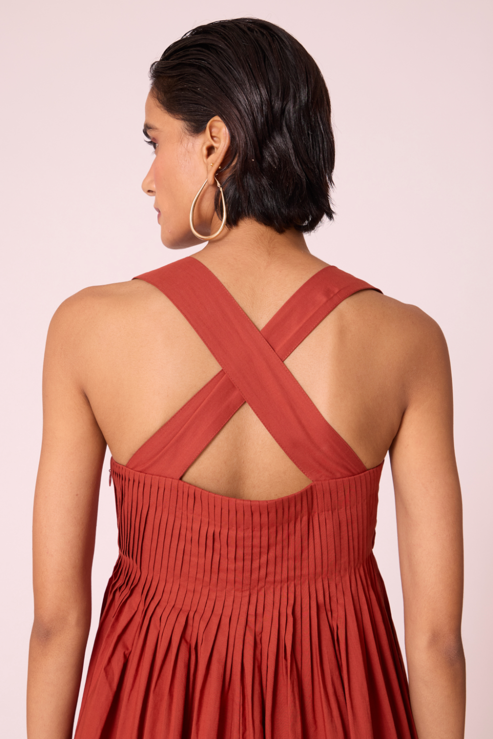 - Pleats engineered from neckline into flare