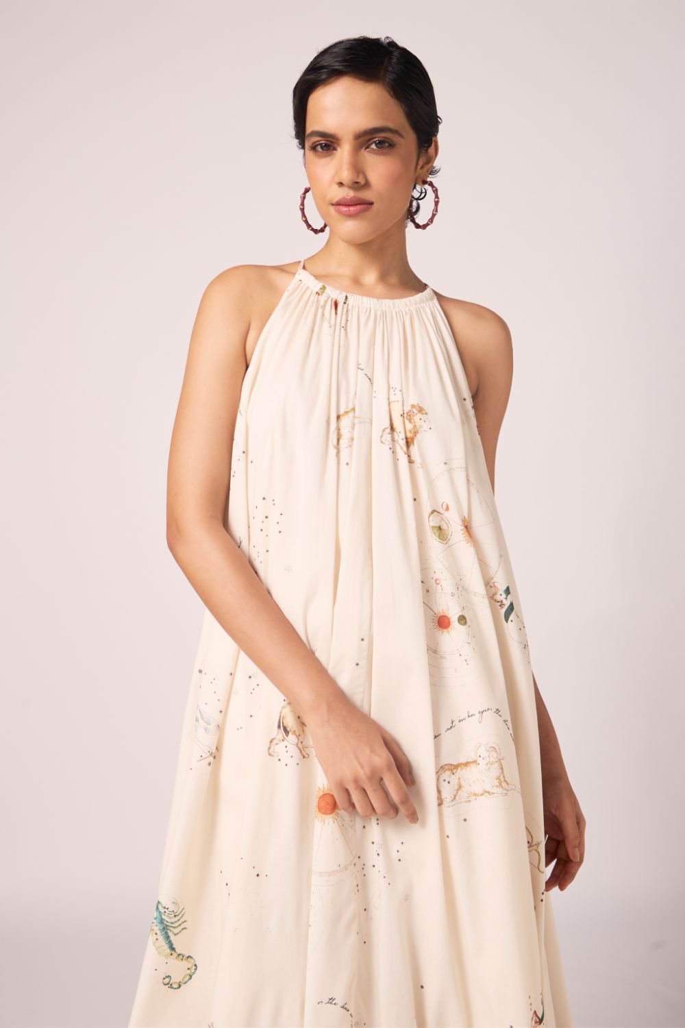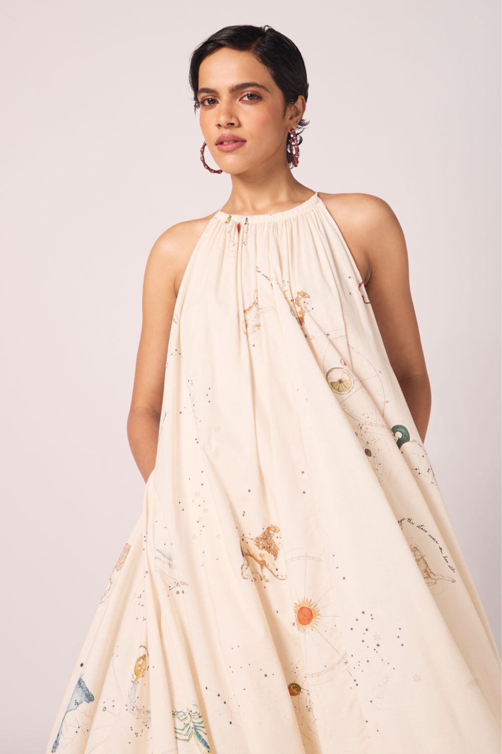 Elongated in line, light in spirit. The shoulder baring halter neckline frames the shoulders, while the print unfurls across the dress, giving scale and depth. A silhouette designed to flatter and move.