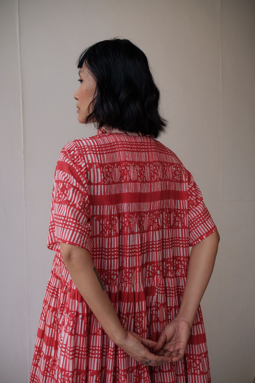 Tiered handblock printed dress in indian cotton.Details of pintucking on neckline .Paired here with a scarf & Maya skirt.
